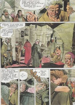 remarques: | Nico Macchia et ses compagnons d'aventure font route vers Le Boucq, ce village des Flandres perdu au milieu des marais et nimbé de brouillard, ils ne pourront l'atteindre qu'après un surprenant périple l'apparition foudroyante d'une enfant sauvage et d'un géant ténébreux, va faire basculer ces chevaliers sans terre dans une odyssée magique et palpitante, l'alchemie et ses secrets, la folie des hommes et les forces des ténèbres sont tout à tour évoqués par le trait baroque et vénéneux d'Ambrosini ce charbonnier de la mort possède la vertigineuse fascination d'un tableau peint par Jérôme Bosch et le souffle épique d'une époque des temps de légende perdus dans les bois, Nico et ses amis sont abordés par une Seline gamine en guenilles qui les guidera >> p. 11 vers la maison du charbonnier de la mort >> p. 7 la gamine Seline et sa poupée Lulubelle >> p. 8 l'onomatopée particulier à Ambronsini: tumph à Boucq, le magicien Dammorfus se livre à des expériences sur la mandragore qu'il veut transplanter dans un cerveau humain pour lui conférer l'immortalité à la recherche de la fille du bourgmestre enlevée, Nico visite un couvent d'abesses lesbiennes >> p. 27 les pensionnaires du couvent >> p. 32 l'histoire du charbonnier-chirurgien le magicien veut s'assurer l'expérience du charbonnier-chirurgien pour ses opérations avec la mandragore le chevalier Nico délivrera les infortunés cobayes avec l'aide de Séline, la fille du charbonnier, qui est également une magicienne >> p. 38 la nuit des Jaggarth >> un récit un peu abracadabrant sans véritable fil conducteur avec un graphisme un moins bon que le premier volume, ceci malgré une couverture d'album plutôt bien réalisée, mais ce deuxième album verra la fin des aventures de Nico Maccia, le chevalier-mercenaire, et ses deux compagnons |