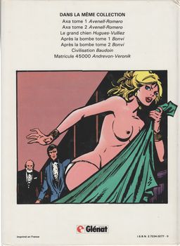 remarques: | la suite des aventures d'Axa, genre de Barbarella préhistorique Axa, héroïne d'un monde post-atomique, chargée d'une mission spéciale, voyage de colonies en colonies terriennnes et arrive sur une île mystérieuse où une famille de milliardaire s'est réfugiée pour se mettre à l'abri de la grande contamination toutefois, comme Axa ne veut pas devenir une jument à reproduction, elle s'échappe de l'île avec le propre fils du propriétaire après que celui-ci eut déclanché la destruction de l'île Axa avec son nouveau ami découvre une colonie aquatique où les femmes gouvernent et exploitent les hommes (juste retour de chose!) Axa y sèmera le désordre et la destruction avant de repartir pour de nouvelles aventures >> deuxième et dernier album sur les aventures d'Axa, des récits décidément un peu trop niaises avec un graphisme tout à fait ordinaire |