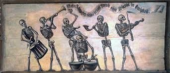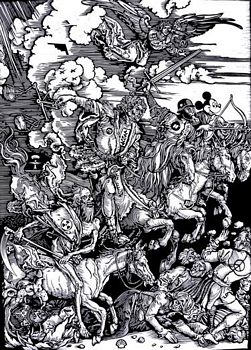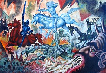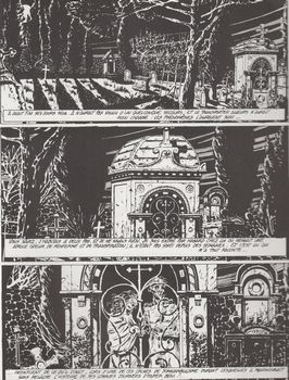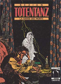 remarques: | ouvrage de la collection "cargo de nuit" ouvrages édités par Magic Strip (14 pièces connues, dont cosmopolis, Alex Magnum, les mémoires de m. Griffaton, etc) l'ouvrage ci-dessous est le seul collectionné ici à titre d'exemplaire représentatif de la collection) multitude de personnages et de destins mais une seule constante... dans un noir et blanc qui fait la part belle aux ombres et aux ambiances inquiétantes, Bézian met en place une bien curieuse danse les spécialistes le savent: les "apparitions", fantômes et autres poltergeist ont chacun leur catégorie, leur type de manifestation, chaque chapitre de cet ouvrage fait référence à des "cas" célèbres de magie noire 1/ le portrait de Doris Wilde thème de la réincarnation = incarnation dans un nouveau corps d'une âme qui avait été unie à un autre corps 2/ les âmes qui pleurent thème de l'ectoplasme = plasma d'origine psychique émané d'un medium, extériorisation se constituant de représentations diverses: organes isolés, êtres humains ou humanoïdes animaux 3/ Byzance la nuit thème des revenants = esprit, âme d'un mort que l'on suppose revenu d'un autre monde >> p. 78/79 l'accouplement avec un revenant 4/ Mausolée phénomène des maisons ou cimetières hantés 5/ avec des corps de plâtres phénomènes paranormaux, wraiths ou hallucinations télépathiques 6/ prière blanche quémandeur de prière, il s'agit d'un cas spécifique de revenant, genre fantôme 7/ mille morts Doppelgänger (dédoublement ou bilocation), souvent présage d'évènements annonçant parfois la mort ou autres changements dans la vie 8/ le doux enfer ma mie le phénomènes "poltergeist" = esprits tapageurs en allemand: polter (faire du bruit, geist (esprit), le poltergeist se manifestant par toutes sortes de sons et d'agissements sur des objets tout en restant une présence invisible >> de courts épisodes pas toujours très clairs de science occulte, toutefois dans ce graphisme ou le noir triomphe, le blanc a l'aspect d'un filet blafard qui adorne le profil des mourants annexes - 1er et 4ème plat de l'album - une page extraite de l'album - diverses illustrations et peintures sur la danse des morts dont les cavaliers de l'apocalypse Information (danse des morts ou danse macabre) la danse macabre est un motif artistique populaire à la fois présent dans le folklore européen et élaboré à la fin du Moyen Âge, elle est un élément, le plus achevé, de l'art macabre du Moyen Âge et du XIVe au XVIe siècle la première danse macabre semble être réalisée à Paris, au Charnier des Saint-Innocents en 1424, elle se nourrit des inquiétudes des temps de crise en y répondant par la force de l'imaginaire, par cette sarabande qui mêle morts et vivants, la danse macabre souligne la vanité des distinctions sociales dont se moque le destin, fauchant le pape comme le pauvre prêtre, l'empereur comme le lansquenet, c'est une leçon morale adressée aux vivants afin de réfléchir à notre condition: elle console les plus pauvres et apprend aux plus grands que personne n'est au-dessus des lois sa composition se fait de manière hiérarchique: elle fait d'abord entrer les "grands" (pape, empereur, roi, cardinal ou patriarche) puis descend l'échelle sociale en faisant entrer les "petits" (laboureur, enfant, cordelier, ermite), les vivants sont donc des personnages représentant les différentes strates sociales et les morts sont squelettiques, dansent, font des cabrioles, se moquent et entraînent vers la mort les vivants, en s'affublant de leurs attributs (couronne, épée, instruments de musique) tout au long du XVème siècle et au début du XVIème, ce thème est peint sur les murs des églises, dans les cimetières d'Europe du Nord, sur les murs extérieurs des cloîtres, les charniers, les ossuaires; au-dessus ou au-dessous de l'illustration sont peints des vers par lesquels la mort s'adresse à la victime, souvent sur un ton sarcastique et empreint de cynisme, il est diffusé à travers l'Europe par les textes poétiques colportés par les troupes de théâtre de rues cette forme d'expression est le résultat d'une prise de conscience et d'une réflexion sur la vie et la mort, dans une période où celle-ci est devenue plus présente et plus traumatisante, les guerres, surtout la guerre de Cent Ans, les famines et la peste, que représentent souvent les quatre cavaliers de l'Apocalypse, ont décimé les populations le thème traverse les époques, de nombreux peintres (Hans Holbein le Jeune), poètes (Baudelaire, Verlaine, Cazalis…), auteurs (Flaubert), musiciens (Liszt, Saint-Saëns, Benjamin Britten, Honegger, Hugo Distler), cinéastes (Fellini, Bergman…) s'emparent du sujet et permettent de redécouvrir ces œuvres tombées dans l'oubli |