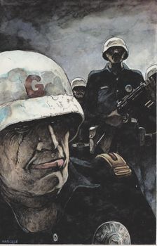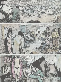 remarques: | aventures anticipatoires et anarcho-écolos, une période indéfinie de la fin du 19ème siècle où une région vit sous un régime totalitaire, Gil, Camille, Colard, Sam... et bien d'autres encore, des gens qui veulent en revenir aux valeurs démocratiques d'antan, vont bientôt se trouver et former un groupe d'action: les "capahuchos", c'est sous ce nom qu'ils vont consacrer leur énergie à combattre les troupes d'un gouverneur tyrannique... Camille, un jeune paysan, part récupérer sa fiancé enlevée par les forces du gouverneur et amenée à Brasno, cité maudite, il rencontrera Jolo et le negro Colard qui deviendront ses amis et qui l'accueillent à Capahucho où sont rassemblés les révolutionnaires, ils feront alors l'éducation militaire de Camille >> p. 2 l'attaque du convoi gouvernemental >> p. 31 dans les appartements du gouverneur Camille fait maintenant partie de la bande de Colard, mais après une expédition punitive sur Capahucho par les troupes du gouverneur, Camille et sa bande jureront de se venger et se feront appeler dorénavant les "capahuchos" (les vengeurs de Capahucho) >>> un graphisme un peu spécial et un scénario pas encore très convaincant n.b. désignation provenant peut'être de crapahuter = se déplacer dans un terrain difficile information Philippe Marcelé est né le 21 février 1943 à Bordeaux, il a réalisé sa première bande dessinée en 1974 publiée par la revue Charlie Mensuel sous le titre "une histoire", ce fut le point de départ d’une collaboration régulière à cette revue jusqu’à sa disparition, parallèlement, Marcelé publie des histoires courtes, satiriques, d’un engagement social très affirmé dans L’Echo des Savanes, en 1979, il réalise une adaptation de "Macbeth" de Shakespeare avec Anne Bellec comme scénariste, la prépublication eut lieu dans Pilote, deux autres albums, à caractère fantastique, suivirent après prépublication dans des numéros spéciaux de Pilote, en 1982, Philippe Marcelé change de registre et se lance dans la politique fiction avec l’album Les Capahuchos |