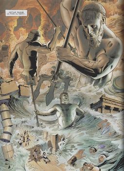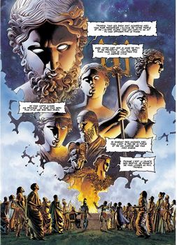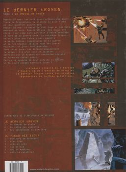remarques: | édition originale mais sans le cahier graphique de 8 pages le dernier Troyen est une série de bande dessinée française créée par la scénariste Valérie Mangin et le dessinateur Thierry Démarez, dont le premier tome est paru en janvier 2004, dans l'univers des chroniques de l'Antiquité galactique commencé avec le fléau des dieux elle est la transposition libre dans un univers de science-fiction spatiale et de fantastique de l'histoire d'Énée, survivant de la chute de Troie, le dernier troyen conte les origines légendaires de la Rome galactique, librement inspiré de l'odyssée d'Homère et de l'énéide de Virgile dans l'orbis romain galactique, le poète Virgile raconte le destin d'Énée, considéré comme le fondateur de l'orbis alors que les habitants de la planète Troie célèbre le départ des grecs Achéens avec qui ils sont en guerre depuis dix ans, ils font entrer dans leurs gigantesques abris souterrains un astéroïde sculpté en forme de cheval comme un trophée Le piège d'Ulysse et le plan des dieux contre Troie se nouent alors, forçant Énée à sauver ce qui peut l'être encore: sa famille et son destin, il sera le fondateur d'un nouvel empire, en quelque sorte le successeur d'Hector >> p. 33 le robot à tête de bélier/taureau pour enfoncer les portes >> p. 38/39 la destruction de Troie décidée par les dieux seul Enée et quelques troyens réussiront à s'échapper pour regagner une nouvelle planète >> p. 48 les hommes sont des jouets, et les dieux des enfants cruels n.b. fils d'Achille et de Déidamie (fille du roi Lycomède), il est élevé par ce dernier sur l'île de Skyros et, selon les chants cypriens, nommé d'abord Pyrrhus, en référence aux cheveux roux hérités de son père, son nom de Néoptolème est en fait dû à Phénix (un noble achéen) peu après la mort de son père, il est amené par Ulysse à Troie: une prophétie d'Hélénos prédit que la cité ne tombera que devant un descendant d'Éaque, selon la prophétie d'Apollon, inspirée par un serpent qui franchit le mur que Poséidon et lui venaient bâtir pour le roi Laomédon, le poète Pindare ajoute que la troisième génération d'Éaque parviendra elle aussi à dépasser le mur divin, Néoptolème est en effet l'arrière-neveu du roi d'Égine, il fait partie des guerriers enfermés dans le cheval de Troie et fait preuve d'une grande cruauté dans le pillage de la ville: il tue le vieux Priam dans le temple de Zeus, jette Astyanax, fils d'Hector, par-dessus les remparts et sacrifie Polyxène sur le bûcher funéraire de son père; les traditions divergent encore au sujet de sa mort, selon les uns, il est assassiné par Oreste, amant d'Hermione, selon d'autres, par les habitants de Delphes où il allait piller le temple d'Apollon pour venger son père >> le récit de l'album est mis en abyme (procédé consistant à représenter une œuvre dans une œuvre similaire, par exemple en incrustant dans une image cette image elle-même), puisqu’elle est racontée par une troupe de théâtre à l’empereur de l’orbis romain ou à des membres de sa famille (voir le fléau des dieux), l'orbis a pris pour histoire officielle qu’il a existé de tout temps, et que tout ce qui a été avant est légendes et mythes. >> la série est une mythologie à la sauce futuriste heroïc-fantasy, reprenant le thème de l'Iliade au moment de la fuite d'Enée et sous un angle différent, mais scénario et graphisme sans grande particularité n.b. le scénario n'est absolument pas original pour tout ceux qui connaissent la très classique guerre de Troie, les atouts SF sont beaucoup moins pertinents que pour la série "le fléau des dieux" le scénario est pauvre et même mal raconté par moment, les dessins sont vraiment très moyens et manque cruellement d'envergure information la dessinatrice et scénariste Valérie Mangin est une artiste prolifique, spécialisée dans l'antiquité futuriste, elle a créé plusieurs séries de ce genre dont: - le dernier troyen (2004-2012) - le fléau des dieux (2000-2009) - imperator (2012, série abandonnée) - drakko (deux albums 2011 et 2012) ainsi que les séries: Luxley - KGB - petit miracle - le club des prédateurs - rayons pour Sidar - le livre de Skell - expérience mort - |
