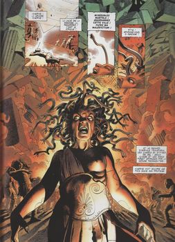 remarques: | album marqué première édition avec carnet graphique de 8 pages relatant les liens entre la série et les œuvres antiques dont elle s'inspire (un cahier intéressant) Enée et les siens arrivent sur la planète des amazones, appelée Thrace-la-Verte mais qui a été frappée de malédiction et qui n'est plus qu'un désert de sel, la planète fut victime de la colère de la déesse Minerve, l'eau se transformant en sel >> p. 17 la mer changée en sel Enee en s'alliant avec la reine des amazones découvrira la raison de cette transformation c'est une méduse qui change les hommes et la nature en sel >> p. 36 la méduse invincible pourtant Enée trouvera la solution pour éliminer la méduse, tout comme dans la mythologie antique, il utilisera des miroirs mais cette fois sous la forme d'écran d'ordinateur laissant la planète reprendre vie, Enee et les siens avec quelques amazones continueront leur périple vers son but final >> cet épisode donne un aspect plus réaliste de l'histoire et il est renforcé par une amélioration du dessin de Thierry Démarrez, de plus, l’intégration d’éléments antiques dans un milieu SF donne un meilleur aspect à ce deuxième tome mais surtout le contenu du cahier graphique adjoint à l'album est particulièrement intéressant, notamment sur l'origine des achéens et des troyens d'Enée qui seront les ancêtres des romains, Enée sera aidé par sa mère, la déesse Venus alors que Minerve, déesse de la guerre, protège le rusé Ulysse épilogue ce deuxième album continue d'explorer les origines de l'empire romain spatial en s'inspirant librement des épopées mythologiques d'Homère et de Virgile Troie est tombée, victime de la cruauté des dieux, seuls Enée et quelques troyens sont parvenus à échapper au massacre, mais les dieux n'ont pas fini de les mettre à l'épreuve, un mystérieux message les attire sur Thrace, la planète des amazones, alliées des troyens pendant la guerre, elles semblent être victimes d'une malédiction qui ronge lentement leur cité, Enée leur apportera son aide annexes - couverture de l'album - la terrible méduse - la méduse dessinée sur le bouclier de guerriers grecs dont elle devait pétrifier symboliquement les ennemis |