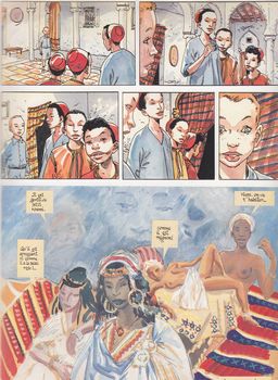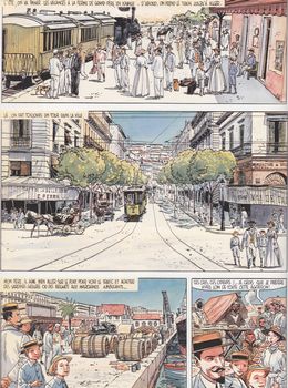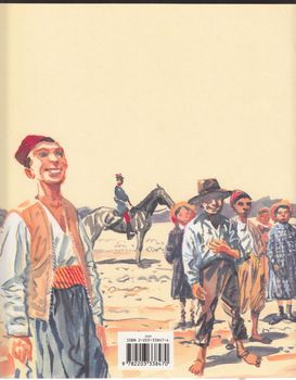 remarques: | Algérie, début du siècle histoire d'une famille française en Algérie dont le père est chef de gare à Ben Ounif sur la ligne Oran-Colomb Béchar en plein Sahara, la vie quotidienne de la famille avec leurs deux fils: Paul et Casimir >> p. 11 description du petit Paul 1/ Ben Ounif, 1904 la gare de Ben Ounif avec du sable partout et une chaleur épouvantable >> p. 15 l'oasis de Figuig >> p. 20 le petit chacal offert par le pacha 2/ le chemin des écoliers l'affaire du bourricot etl'école obligatoire, même pour les juifs mais pas pour les arabes 3/ Kébir les copains de Paul: Kébir = nom donné au petit chacal, son frère Casimir et Antonio, gardien de cochons >> p. 33 la femme à poil >> p. 39 les Bat-d'Af = les militaires têtes-brulés >> p. 43 un instituteur décrit comme dreyfusard (référence au capitaine juif Dreyfus) >> p. 47 mourir noyé dans le désert 4/ Mascara 1905 son père mutéà Mascara, gare de marchandises, près d'Oran, Paul doit se séparer de Kébir, Abderhamane le jardinier du chef de gare, le fléau des sauterelles qui détruisent tout, mais qu'on peut aussi manger 5/ certificat d'études >> p. 62 apprendre des pages par coeur, les cheveux dans les encriers qui causent des ratures, thème d'histoire: Napoleon est trop connu, mieux vaut choisir un personnage moins connu vacances de travail chez le grand-père avec premier salaire et en p. 70 le fameux tableau de Constant 6/ Alger 1914 mobilisation, Paul est engagé dans les zouaves, ce seront les fils du sud qui partent à la guerre >> toujours un scénario bien développé avec un bon graphisme, en début d'albums à nouveau de nombreux croquis et aquarelles de l'auteur |