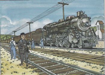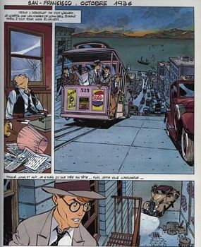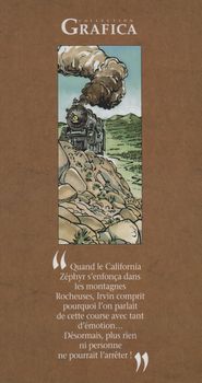 remarques: | premier et unique album dans cette série la vie aventureuse du vagabond d'Irvin Jordan en 1936 qui "brûle le dur" (= l'art de voyager sans billet) sur la ligne California Zephyr vers la Californie à travers les Rocheuses mais il faut compter avec les serre-freins (= gardiens de convoi) qui peuvent être très méchants et qui ont causé la mort de nombreux vagabonds en les pourchassant sur les convois le tout sur fond de crise économique lors de la dépression de 1930, un récit probablement tiré de deux films - l'empereur du nord (1973), emperor of the North Pole et - les raisins de la colère (1940), grapes of wrath >> un scénario très banal avec un tout pauvre graphisme malgré une couverture d'album assez bien conçue information le California Zephyr est un train mythique américain, reliant Chicago à la Côte ouest des États-Unis, il symbolise la Conquête de l'Ouest le California Zephyr relie Chicago à San Francisco actuellement en trois jours en passant par les États de Californie, du Nevada, de l'Utah, du Colorado, du Nebraska, de l'Iowa et de l'Illinois, en traversant des paysages uniques: déserts, forêts, canyons les voyageurs chevronnés disent que le voyage à bord du California Zephyr est l'un des plus beaux voyages en train en Amérique du Nord, le Zephyr voyage quotidiennement entre Chicago et San Francisco, filant à travers les plaines du Nebraska jusqu'à Denver, de par les Rocheuses jusqu'à Salt Lake City en passant par Reno et Sacramento jusqu'à Emeryville/San Francisco. parmi les attraits pittoresques: Montagnes Rocheuses, Sierra Nevada, Moffat Tunnel, Canyons Gore, Byers et Glenwood du Colorado, Winter Park, Truckee River, Donner Lake, San Pablo Bay et Carquinez Strait |