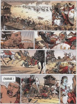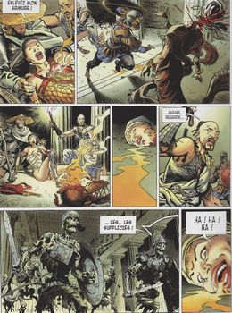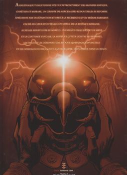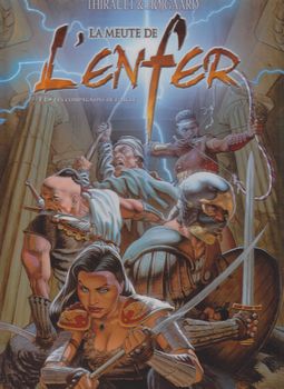 remarques: | en ce début de 6e siècle, il ne subsiste de l’empire Romain que sa partie orientale, Rome a perdu sa splendeur d’antan et c’est la ville de Ravenne qui l’a supplanté, avec à sa tête Théodoric, roi des Goths, désormais Rex Gloriosissimus, c’est ce chef barbare devenu régent impérial qui dirige maintenant les armées impériales d’Occident. face à lui se dresse Byzance et son empereur Justinien, maître de l’empire chrétien d’Orient, sa femme Théodora Augusta œuvre dans l’ombre, épaulant son mari dans sa tâche impériale, la jeune impératrice a la réputation d’être une manipulatrice implacable, crainte par nombre des habitants du palais, toujours proche des anciens dieux Romains, elle a pour allié un sorcier nommé Epidamnos, le guerrier-mage c’est sur la demande de Théodora que le sorcier va reconstituer la Meute de l’Enfer, une troupe de mercenaires redoutables à laquelle il appartenait quelques années auparavant, ses compagnons s’étaient séparés après la mort de leur chef, mais un à un, les mercenaires vieillissants répondront à l’appel d’Epidammos il s'agit de Triada l'archère noire, de Camarinée la panthère-princesse de Thrace, Khorsabad Trois Mains et Harane l'Aigle, mais la meute a été amputée de son meilleur membre: Moundhir le Harith ensemble, ils partiront à la recherche d’un trésor mythique: "le tribut des dieux", dernier legs laissé par les empereurs romains à leurs anciennes divinités >> p. 9 les dons magiques de Camarinée, l'aveugle >> p. 26 la façe atrophiée de l'Aigle une première étape est franchie dans le temple des non-vivants égyptiens >> un scénario de pur heroïc-fantasy qui est surtout fantaisiste mais un graphisme assez bien effectué la série est constituée de quatre albums, mais seuls les trois premiers sont collectionnés ici |