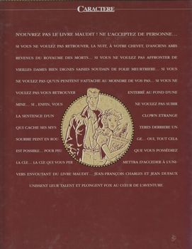 remarques: | la série Fox fait appel à l'aventure, au fantastique et au suspense, parcourant un monde de mystères et de sortilèges, de charme et de frissons, Fox est l'aventurier avec un grand A, genre Indiana Jones, explorateur des arcanes d'un savoir perdu dans la mémoire des siècles, de l'Egypte oubliée aux landes d'Ecosse en passant par l'Amérique, il donne l'occasion au tandem Charles/Dufaux de se livrer à un véritable safari du fantastique "le livre maudit", premier tome d'une série où l’occultisme se paye une part de lion Fox, héros américain et fier de l’être, se retrouve malgré lui dans une histoire palpitante, peu de temps après la seconde guerre mondiale l’intrigue dans ce premier tome est assez cohérente et devrait satisfaire les admirateurs de H.P. Lovecraft les illustrations de Charles, qui s’amélioreront vite au fur et à mesure de la série, sont toutefois dans ce premier tome assez brouillon l'histoire d'allan Rupert Fox, aviateur américain et >> p. 13 sa Harley Davidson WLA 45 baptisée Ava Gardner avant de mourir, un homme remet à Edith, petite amie de Fox, un livre mystérieux qui cause la mort de ceux qui le lisent Fox décide d'étudier le livre et, contrairement à ceux qui provoque un feu infernal en le lisant, le livre s'éteint dans les mains de Fox c'est le livre de Toth, le message des dieux où est consigné la somme des connaissances universelles par la suite, Edith est enlevée par un clown et en la recherchant, l'enquête de Fox l'amène en Egypte >> un premier volet pas encore vraiment au point mais qui se laisse lire plutôt facilement alors que le graphisme est un peu fragile |