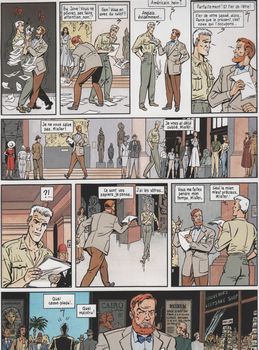 remarques: | ce second volet des aventures de Fox se déroule dans un contexte pour le moins original: l’Egypte de l’après guerre le scénario de Dufaux nous emmène cette fois un peu plus loin que lors du premier tome, atmosphère baignée de vieilles croyances égyptiennes, personnages à la personnalité changeante arrivé au Caire, Fox se rend à la boutique d'Atoumnah qui a été mystérieusement dévastée par des babouins >> p. 10 en criant le code sacré "raïs el djemat" relatif au livre maudit, les babouins cessent leur attaque Edith qui avait été enlevée par le clown se retrouve à l'intérieur d'un sanctuaire dont elle cherche la sortie, elle sera sauvée par un mystérieux homme noir coiffé de lunettes >> p. 23 petit exposé sur la mythologie égyptienne (d'ailleurs bien connu) Toth, le dieu de la connaissance et Manéthon, le scribe le plus savant, auteur d'une histoire de l'Egypte répétition de l'histoire du livre de Toth, le livre maudit >> p. 29 clin d'oeil à E.P. Jacobs avec le prof. Mortimer qui rencontre Fox dans le musée du Caire (une rencontre d'ailleurs peu sympathique) pour contrôler lie livre, il faut passer l'épreuve de l'initiation: le Ank-en-Maat, le miroir de vérité Edith retrouvée, Fox se rend au temple de Karnak où lord Calder serait sur les traces du livre maudit (l'original, celui de Fox n'étant qu'une copie!) >> p. 29 nouvelle attaque de babouins >> ce deuxième tome n'est toujours pas exceptionnel, le scénario n'est pas convaincant et seul le graphisme montre quelque amélioration |