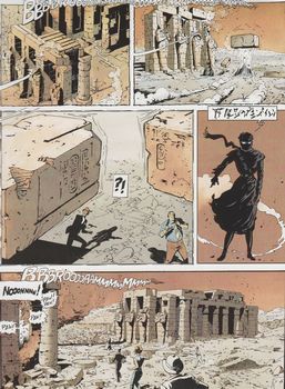 remarques: | Fox est donc arrivé en Egypte et a délivré Edith qui a subi une bien curieuse aventure: elle a été soumise par le clown blanc à l'épreuve du miroir, pour savoir si elle était initiée au secret du livre de Toth, Edith a gardé quelques séquelles de cette aventure, néanmoins on la retrouve avec Fox sur une île paradisiaque, l'île des bananes au niveau de l'histoire, ce tome récapitule quelque peu les deux premiers volumes, ce qui permet de remettre les idées en place (on en a vraiment un peu besoin car le paranormal s'est bien développé et on y perd un peu le fil de l'histoire), mais à peine ce rappel explicatif effectué, le scénario retombe dans les mêmes travers: beaucoup d'ellipses, le passage d'un personnage à un autre, de façon un peu aléatoire et surtout on fait quelque peu du surplace (dont le rôle du clown blanc dont on découvre l'identité = lord Calder) résumé Fox possède la clé (laquelle?) et le code (raïs el djemat) et se retrouve avec Edith dans l'île des bananes (pour les babouins?) >> p. 13 l'eau qui se change en sang >> p. 13 le fameux livre maudit indestructible par l'eau ou le feu par la suite, l'équipe se rend dans la vallée des rois >> p. 22 apparition fantômatique de l'homme en noir qui élimine ses adversaires avec le code miraculeux >> p. 25 une affaire de bas filé pour Edith en Egypte par cette chaleur! et les babouins sont à nouveau de la partie, avec en plus un serpent aspic qui mord à tout vent et l'homme noir qui reprend du service >> p. 42 un vieux souvenir de Rommel = un stuka qui se met à bombarder l'équipe Fox >> un livre maudit et un album non béni des dieux si le graphisme se distingue avec quelques belles illustrations (dont des vignettes vaguement érotiques), il n'en est pas de même pour le scénario qui est vraiment peu ordonné et plutôt incohérent avec des interjections en anglais qui ne l'améliorent pas |