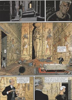remarques: | Fox poursuit son parcours initiatique, guidé par le mystérieux homme noir masqué, cette quête de la connaissance des dieux va le conduire jusqu'à un temple engloutis par les eaux, mais quel est donc ce secret de la connaissance? comment y accède-t-ton? autant de questions que l'initié devrait résoudre pour le bien du lecteur résumé début de l'album avec deux archéologues allemands qui découvrent un sanctuaire secret, la chambre du gardien qui surveille le tombeau du dieu Seth, un dieu violent, qui se fait appeler le dieu rouge (par le sang?) tandis que Fox et son équipe explorent les ruines submergées du temple de Philae, le domaine d'Isis, épouse d'Osiris >> p. 16 apparition de la princesse égyptienne qui, sous l'eau, avec ses crocodiles sacrés, part à la rencontre de Fox en scaphandre >> p. 22 Fox se retrouve dans une chambre mortuaire habitée par un lord anglais qui lui offre du champagne et dont les gardiens sont les fameux babouins un peu plus tard, Fox, rescapé miraculeux, se retrouve avec Edith sur l'île Elephantine dernier affrontement avec le dieu rouge et le duo Fox/Edith se retrouvent dans la mine de charbon d'où l'histoire était partie dans le premier volume, les formes noires des mines de charbon s'opposant aux mêmes formes que les pyramides qui sont elles toutefois de couleur différente >>> fin de l'épisode égyptien qui clôture ce premier cycle avec plusieurs questions non résolues, ce qui reste donc énigmatique et qui ne répond pas à l'attente du lecteur on fait surtout de l'égyptologie dans ce quatrième album dont le texte reste tout aussi obscur que des mastabas égyptiens, reste le graphisme qui peut parfois devenir assez intéressant |