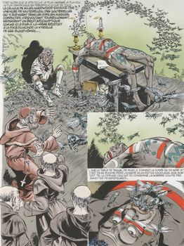 remarques: | les prisonniers du dr Fox meurent mystérieusement, le retour de Miles Hardwood mort un siècle auparavant dans un couvent, un signe ensanglanté apparaît sur le mur annonçant le retour de Miles, créature à l'âme noire ayant été humaine autrefois >> p. 25 la marque de Miles l'histoire de Miles Hardwood qui était atteint d'un mal étrange > p. 36 l'image de la dévastation et du caveau des Hardwood sortent des morts-vivants qui veulent venger leur maître on réussira à s'en débarrasser après bien des malheurs et chez un dernier personnage du drame s'annoncent deux personnes: HP Lovecraft et son assistant >> un récit d'épouvante à la Dufaux (inspiré des récits fantastiques de Lovecraft) dont il n'est pas toujours facile de suivre le développement mais le graphisme de Paape reste excellent avec une couverture d'album bien exécutée information Du "Dufaux" reste du Dufaux, que ce soit pour les séries Jessica Blandy ou Santiago, les enfants de la salamandre, Fox, Le maître des brumes, etc les protagonistes semblent tous cacher un passé douteux, lourd - tout le monde paraît suspect- et froid cet album a de fortes similitudes avec d'autres séries de Dufaux: Monsieur Noir ou le maître des brumes notament l'ensemble est assez intéressant même si la quête est peu prenante, les dessins d'Eddy Paape et de son assistant Jean claude Sohier sont par contre excellents et facilitent a eux seuls la lecture d'un scénario d'une très grande noirceur, cette bd est toutefois loin d'être un chef d'oeuvre! |
