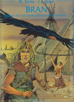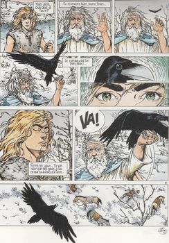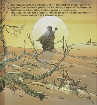 remarques: | album cartonné avec 2 pages de croquis en fin d'album, dernier et unique album de cette série non continuée, légende née des tourbillons des vents du nord nous sommes dans la période du néolithique durant laquelle le village de Bran du clan des Sameh se fait attaquer par des cavaliers au physique mongoloïde, Bran se montre des plus courageux mais son père Kiruno, le renvoie dans la tente des femmes, pour bien montrer qu'il vaut mieux que cela, Bran se met à poursuivre un groupe de fuyards, il capture et fait prisonnier un membre de la tribu des Tsagaï-Nour mais un mystérieux corbeau noir surgit soudain, ce sera le début d'une initiation pour Bran qui l'amènera à défier le père >> p. 12 la vie dans une hutte du clan Sameh = genre de tipi indien géant >> un graphisme tout à fait respectable; quant au récit c'est une réflexion sur les rapports entre les hommes et les dieux, le combat contre la fatalité et le poids du destin, l'histoire s'ouvre sur une très traditionnelle montée de l'adolescence à l'adulte, mais à partir de la planche 18, le scénario s'empêtre dans des élucubrations onirico-Jodorowskyennes pour finir en queue de poisson dans les 3 dernières cases |