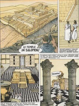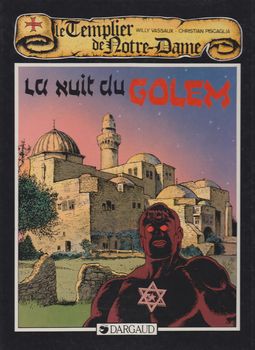 remarques: | un deuxième tome qui mentionne la kabbale, un mot qui fait frémir les non-initiés, qui mène à la folie les chercheurs de pouvoirs, car devant la lumière de la connaissance a surgi l'ombre du golem, cette statue d'argile qu'anime une intarrissable vie la suite des tribulations rocambolesques et kabbalistiques du pauvre chevalier de Notre-Dame, arrivé avec Aurore et Brise-Pierre à Jérusalem, assiégée par les sarrasins alors qu'une monstruosité, le Golem, fait son apparition sèmant la terreur autant chez les chrétiens que chez les sarrasins >> p. 24/25 l'apparition du Golem blessé dans les combats, Aurore conduit le chevalier Sinclair chez un magicien juif qui guérira Sinclair et lui donnera par la même occasion le moyen de neutraliser le Golem après quoi, Sinclair et Aurore découvriront les vestiges de l'ancienne Jerusalem: >> p. 50 le temple de Salomon, la mer d'airain ainsi que les deux colonnes de bronze: Yakinn et Boaz >> p. 60 la destruction du Golem par le feu astral et le trio sera prêt pour un nouveau voyage avec de nouvelles découvertes >> à nouveau un scénario vraiment compliqué, un texte ésotérique à n'en plus connaître le sens, sans fil conducteur mais le graphisme reste encore acceptable sans être inoubliable! avec cet album finit la première série du chevalier de Notre-Dame, la série sera reprise 10 ans plus tard par les éditions Dervy Information - kabbale = traduction juive donnant une interprétation mystique et allégorique de l'Ancien Testament, c'est la tradition ésotérique du judaïsme, présentée comme la "loi orale et secrète" donnée par Yaweh (Dieu) à Moïse sur le mont Sinaï, en même temps que la "loi écrite et publique" (la Torah) - Golem = en hébreu: être informe ou inachevé, dans la mystique puis la mythologie juive, un être artificiel, généralement humanoïde, fait d’argile, incapable de parole et dépourvu de libre-arbitre, façonné afin d’assister ou défendre son créateur (il aurait été créé par le rabbin Maharal de Prague nommé Yehudah-Leib) sur son front figure le mot emet (vérité) et pour le neutraliser il faut effacer la première lettre = met (mort) faisant retourner l’homme artificiel à la poussière les légendes du Golem auraient inspiré nombre de figures de l’imaginaire moderne dont le monstre de Frankenstein |