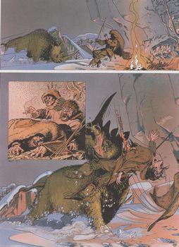 remarques: | prélude de Haroun Tazieff pour entrer dans l'univers de la préhistoire l'histoire se passe au pied du massif du Vercors, il y a env. 15'000 ans, une période glaciale où les hommes primitifs vivent dans des grottes et dont certains se livrent déjà à la peinture rupestre pendant plusieurs jours, les hommes ont surveillé, inquiets, un grand feu de forêt qui finit par s'éteindre de lui-même mais un peu plus tard, l'esprit mauvais qui était dans le feu réapparait sous la forme d'un monstre inconnu à la tête mutilée c'est un rhinocéros laineux à qui un vieux prédicateur de la tribu donne le nom de "tête-brulée" ou "boulouf" (démon) >> p. 16/17 le combat entre les hommes et tête-brûlée les hommes doivent se retirer devant la force de tête-brûlée Nak, dont la main a été broyée durant le combat avec tête-brûlée, prépare un piège et réussira à faire tomber tête-brûlée dans un précipice mais Nak y perdra aussi la vie à nouveau un petit lexique néolithique en fin d'album la civilisation du magdalénien (homme de Cromagnon) du nom de l'abri sous roche de la Madeleine en Dordogne vers 15'000 ans BC = paléolithique supérieur le genre de vie, travail de l'os au grattoir de silex, une faune plutôt riche dont le mammouth et le rhinocéros laineux >> un album moins instructif dont le héros est tête-brûlée avec un graphisme toujours respectable et un nouveau cahier de 5 pages: la vie à l'époque des grands chasseurs de la préhistoire |