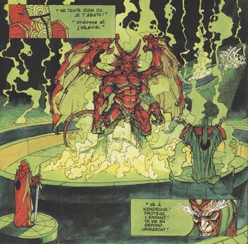 remarques: | édition originale intitulée "le signe des ténèbres" du premier tome de cette série qui comprend en tout 20 albums (voir information) les chroniques de la Lune noire relatent le destin épique du jeune Wismerhill et de ses compagnons, dans un univers médiéval fantastique dominé par le conflit entre des puissances divines et sur l'échiquier duquel les héros vont jouer un rôle central l'oracle prédit à l'empereur de Lyhnn la venue de "l'archer chien de métal" qui causera la fin de son empire, Wismerhill (de Whispers Hill, la colline aux murmures), un demi-elfe ténébreux, se trouve de par son destin exceptionnel au centre d'enjeux colossaux opposant l'Empereur au maître de la Lune noire, l'archimage Haazeel Thorn dans ce premier tome, Wismerhill et Pile-ou-façe, son compagnon, sont sur la route de l'aventure semblables aux tribulations de Don Quichotte et de Sancho Pança et un jour, ils doivent affronter >> p. 10 la horde de Ghorghor Bey mais Wismerhill rencontrera aussi Feidreiva, fille de Ghorghor Bey avec qui il aura non une lune noire mais une lune d'amour, puis ce sera la guerre contre l'empire de Lhynn >> p. 22 en ordre de bataille >> p. 32 l'oracle qui se manifeste >> un récit de pur heroïc-fantasy teinté d'humour et des illustrations à grande échelle genre Druillet, le scénario se caractérisant par une trame machiavélique qui contraste avec l'humour décalé des personnages cette série de bande dessinée, dont le premier épisode remonte à la fin des années 1980, est très fortement inspirée de l'univers des jeux de rôle médiévaux-fantastiques des années 1980-1990 dont Froideval a une longue expérience en tant que scénariste, peignant un univers riche en guerres et en magie, où la surenchère constante des forces en jeu donne toute l'ampleur au rôle de ses protagonistes information ce premier volume fait partie d'une série de 20 volumes + un no 0 soit: - tome 2 le vent des dragons (1990) - tome 3 la marque des démons (1991) - tome 4 quand sifflent les serpents (1992) - tome 5 la danse écarlate (1994)>> n.b. éd. Dargaud à partir du tome 5 - tome 6 la couronne des ombres (1995) - tome 7 de vents, de jade et de jais (1997) - tome 8 le glaive de justice (1998) - tome 9 les chants de la négation (2000) - tome 10 l'aigle foudroyé (2002) - tome 11 ave tenebrae (2003) - tome 12 la porte des enfers (2005) - tome 13 la prophétie (2006) - tome 14 la fin des temps (2008) - tome 15 terra secunda, livre 1 (2012) - tome 16 terra secunda, livre 2 (2014) - tome 17 guerres ophidiennes (2015) - tome 18 le trône d'Opale (2017) - tome 19 une semaine ordinaire (2018) - tome 20 une porte sur l'enfer (2019) n.b. la lune noire a pris une teinte de jaune! + un numéro 0 en un jeu cruel (2010) à noter que plusieurs dessinateurs se sont succédés dans cette série n.b. seul le tome 1 est collectionné ici à titre d'exemplaire représentatif de la série annexes - couverture, page de garde et extraits de l'album - couverture du dernier album (2019) |
