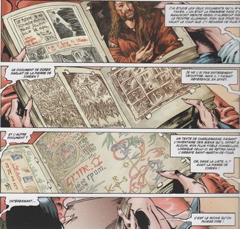 remarques: | premier tome de cette série qui comprend deux albums dont le tome 2 la pierre de Iorden (2009) seul le premier tome est collectionné ici installé aux États-Unis, Damien Louvel rentre en France à la suite du décès tragique de son père, il découvre alors que celui-ci recherchait un mystérieux objet: la pierre de Iorden, >> p. 10 le père de Louvel, un grand collectionneur de livres Damien décide de poursuivre les investigations de son père et se lance dans une enquête qui va bouleverser sa vie à jamais et le mener sur la piste des Templiers, des francs-maçons et d'Albrecht Dürer traqué et menacé par le Bilderbeg, un groupe ultra-secret d'extrême-droite mais aidé par la journaliste Diana, il tentera de mettre au jour le plus vieux secret de l'humanité: le dernier message laissé par le Christ >> p. 26 celui qui connaîtra le mystère de la pierre d'Iorden sera digne de recevoir la gnose telle qu'elle fut livrée pendant la transfiguraiton du Christ sur le mont Thabor (gnose = concept philosophico-religieux selon lequel le salut de l'âme passe par une connaissance (expérience ou révélation) directe de la divinité et donc par une connaissance de soi >> p. 29 description du groupe Bilderberg >> p. 48 la pierre de Iorden serait d'après Dürer le seul et unique message laissé directement par le Christ de sa main (ce serait une véritable bombe atomique!!) n.b. cette bande dessinée est l'adaptation du roman d'Henri Loebenbruck >> un scénario et texte philosophique mêlés à une intrigue peu recherchée sur un thème archi-connu (dans le même genre: les carnets secrets du Vatican, le 5ème évangile, l'ordre des dragons, la rose et la croix) et un graphisme qui pourrait être mieux étudié annexes: - couverture, 4me plat et extrait du tome 1 - couverture du tome 2 (non collectionné ici) |