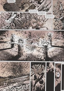 remarques: | intitulé tome 1 de l'abîme, la lumière, ce sera le premier et unique album de cette série pour avoir combattu et croisé le regard d'un Dieu, Ramsey Ligorn, sorcier de son état, a perdu l'esprit, interné dans un asile psychiatrique, il est enlevé par Lönson, dit "Le Céleste Noir", son ennemi juré, ce dernier, messager de la cause divine, veut prévenir l'humanité que ses maîtres se préparent à reconquérir la Terre, au même moment, le professeur Lindsay Eggart tente de traduire un texte ancien et mythique, aux pouvoirs surnaturels, mystérieusement ressurgi du passé, le livre "ex abisso lumen", le monde a-t-il une chance de s'en sortir face aux forces démoniaques? >> p. 13 le site pré-colombien des serviteurs d'Iver: une divinité anidéluvienne deux thèmes principaux dans ce récit - l'ex abisso lumen = ouvrage médiéval qui rassemble les connaissances qui permirent l'exil des dieux anciens, mais protégé par une étrange magie, le livre est impénétrable - le Celeste noir = Lönson, le messager des dieux anciens qui annonce la volonté de ces dieux à reconquérir le monde >> le graphisme est semé d'ectoplasmes avec un scénario peu céleste, genre poltergeist n.b. autre série de ce genre "le testament du docteur M", non collectionné ici information il ne faut pas être fin psychologue pour deviner que l'auteur est fan de l'univers de Lovecraft, contrairement à des récits comme U-29 ou Nyarlathotep, le céleste noir n'est pas une adaptation mais une histoire originale dont le thème et l'ambiance s'inspirent de Lovecraft les lecteurs du mythe de Cthulhu ne seront pas dépaysés: créatures maléfiques venues du fond des âges et souhaitant envahir la Terre, textes magiques et impénétrables renfermant de terribles secrets et surtout une ambiance lourde et glauque à souhait mais sans réussir vraiment à restituer le climat d'angoisse si caractéristique de l'œuvre de Lovecraft enveloppé d'une entité nébuleuse, intemporelle et cruelle, l'intrigue s'entoure d'une aura mystérieuse et envoûtante, elle laisse toutefois des images de personnages au rang de faire-valoir à commencer par Ramsey Ligorn, sorcier émérite, qui entame le récit par une condition peu enviée de déséquilibré mental, puis Lindsay Eggart, qui a du mal à concilier sa vie de famille et ses activités professionnelles de traductrice |
