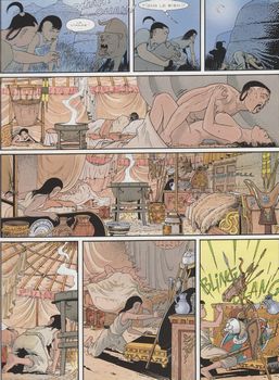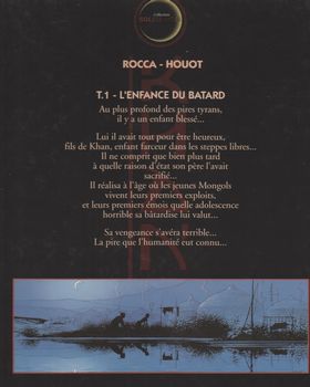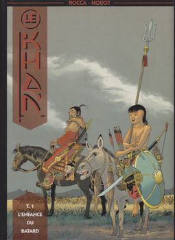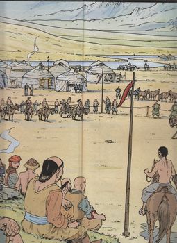 remarques: | 1227 Mongolie, Temoudjin va devenir le Grand Gengis Khan que l'on connait ce premier volume débute l'histoire de ce pauvre enfant des steppes qui deviendra le plus grand Khan de tous les temps! Genghis Khan est probablement l’un des plus grands de l’histoire de l’humanité, en effet, il reste l’homme qui aura su bâtir, à partir du XIème siècle, le plus grand empire du monde en annexant jour après jour des territoires qui iront jusqu’à relier l’Europe centrale à l’actuel Japon d’ouest en est, et la Sibérie aux portes de l’Inde du nord au sud, en plus de cela, ce mythique Khan est resté mystérieux jusqu’à nos jours, il serait enterré quelque part en Asie centrale avec son trésor et personne encore n’a retrouvé sa sépulture. bien que vastes comme des océans et, à nos yeux, terriblement monotones, les steppes de la Mongolie sont pourtant le décor historique du creuset de l’irrésistible montée en puissance de Genghis Khan, ce personnage est d’ailleurs, depuis le début des années 1990, redevenu une fierté nationale en Mongolie Extérieure, donnant à nouveau à ce pays une identité forte après les années écoulées sous l’ère de l’ex-URSS résumé Yesugaï, chef des Borijins, une tribu mongole, apprend la naissance d'un fils qu'il nomme Temoudjin et à 6 ans, Temoudjin montre déjà un caractère indépendant de commandeur >> p. 20 l'éducation de Temoudjin et ses farces à 14 ans, il rencontre Bortaï, fille de Deï-Sechen, bagatour (= le brave), chef des Ongirats, un clan puissant dont l'alliance avec les Borijins pourrait créer une des premières tribus de la steppe mongole Deï-Sechen s'engage à parfaire la formation de Temoudjin à la mort de son père, Temoudjin est déjà un adolescent avisé mais il ne peut encore pas envisager d'être le chef d'une tribu, devenir khan, c'est pas du French khan-khan! >> le scénario de Rocca n'égale encore pas la valeur d'autres séries, tel celle de Vae Victis et le graphisme n'est pas très recherché mais le tout reste correcte et va devenir une excellente série information Gengis Khan, littéralement "souverain universel" d'abord nommé Temoudjin, né vers 1155 pendant le Khamag Mongol, dans ce qui correspond à l'actuelle province de Khentii en Mongolie, mort en août 12272 dans l'actuel Xian de Qingshui (Chine), est le fondateur de l'Empire mongol, le plus vaste empire continu de tous les temps, estimé lors de son extension maximale à 33,2 millions de km2 en 1268 sous Kubilai Khan issu d'un chef de clan de la tribu Bordjigin, il utilise son génie politique et militaire pour rassembler plusieurs tribus nomades de l'Asie de l'Est et de l'Asie centrale sous l'identité commune de "mongoles", il en devient le khan (dirigeant), puis le Tchingis Khagan (empereur ou chef suprême), avant même de se lancer à la conquête de la Chine à la fin de son règne, il contrôle une grande partie de l'Asie, avec, outre la Mongolie, la Chine du nord et la Sogdiane (région historique recouvrant en partie l'Ouzbékistan, le Tadjikistan et l'Afghanistan et englobant les villes historiques de Samarcande et Boukhara) après sa mort, l'empire est considérablement agrandi par ses successeurs qui le dirigent encore pendant plus de 150 ans, son petit-fils, Kubilaï Khan, est le premier empereur de la dynastie Yuan en Chine pour les Mongols, qui le considèrent comme le père de leur nation, Gengis Khan est une figure légendaire entourée d'un grand respect, mais, dans nombre de régions d'Asie ravagées par ses guerres ou celles de ses successeurs, il est considéré comme un conquérant impitoyable et sanguinaire, il a établi des lois en faveur des femmes, pour éviter les conflits entre tribus, ainsi, l'interdiction d'enlever des femmes, de les vendre à des époux et l'interdiction de l'adultère sont les principes de son empire |