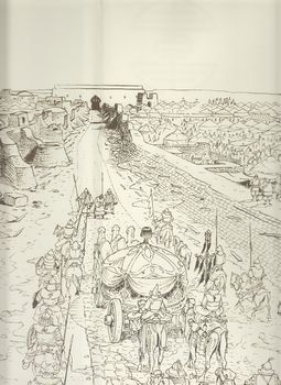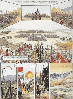 remarques: | la prochaine campagne de Gengis khan l'amène aux portes de l'empire Kin dont la Grande Muraille le nargue, gardienne des richesses qu'on dit pouvoir trouver lorsqu'on parvient à la passer à noter: le plan de Gengis Khan pour franchir la grande muraille et entrer dans le pays Kin (reconnaisance en se déguisant en marchands) Gengis khan réduit d'abord en esclavage les tribus Oigours, situés au nord de la grande muraille, ceci pour s'assurer de ses arrières, puis son armée se présente devant le premier obstacle: la forteresse Tsaï Gengis khan prend comme conseiller, un membre exilé de la tribu des Tsaï, du nom de Liou Tchou Tsaï qui lui restera fidèle jusqu'à sa mort, mais trahi par les chefs Tsaï, Gengis khan effectuera son premier génocide sur le peuple tsaï >> p. 15 les montagnes de cadavres et à cause d'une femme (qui deviendra sa maîtresse), Gengis khan manque de perdre la vie >> p. 20 le camp de la horde mort de Hoelun, mère de Gengis khan qui doit en plus faire façe à la révolte de son général Qasar, Gengis khan prend comme maîtresse, Qulan, une esclave oïgour, qui prendra à ses côtés une grande importance mais qui ne deviendra pas sa seconde épouse, Gengis khan restant fidèle à Bortaï >> p. 29 la parade de l'armée de Gengis Khan puis Gengis Khan emmène ses armées vers le pays Kin, le pays du Levant, où l'attendent de grands combats malgré l'utilisations par les kins de la poudre tonnante qui n'arrêtera toutefois pas l'avance de la horde mongole, les têtes tombent à profusion alors que la horde s'enfonce dans le pays kin comme dans du beurre de yak mais son conseiller chinois Liou l'avertit de ne pas s'enliser dans ce beurre chinois, une nouvelle armée chinoise est anéantie sur les bords du fleuve Houei, Pékin est bientôt à la portée des armées mongoles mais Gengis Khan doit faire façe à une nouvelle tactique, les forteresses chinoises sont solides et résistantes et Gengis khan doit apprendre à faire le siège de cités bien défendues mort de sa favorite Qulan (accident ou assassinat?), on ne le saura pas vraiment mais à partir de ce moment, Gengis Khan deviendra encore plus cruel envers les chefs ennemis tombés en son pouvoir >> p. 42 le supplice du chef Kara Kithay le pays Kin ne sera plus un grand problème pour Gengis khan qui laisse finir la conquête de la Chine par ses généraux, la Chine ne sera toutefois entièrement conquise que vingt ans plus tard, Gengis Khan se tourne maintenant ves l'ouest, vers le Couchant, le royaume du shah de Perse, les loups de la horde sont prêts à de nouvelles conquêtes >> un récit de conquête mais bien rédigé et un graphisme toujours de bonne qualité |