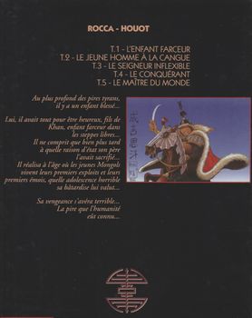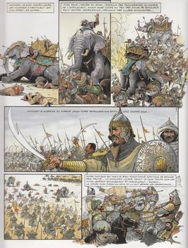 remarques: | prélude: mort de Gengis khan en 1227, Liou Chou Tsaï, son fidèle conseiller et Baa-tu, son général sont chargés de rapatrier son corps dans sa capitale Karakoroum 20 ans plus tôt, une nouvelle armée mongole se dirigeait vers l'Ouest, vers le Couchant vers le royaume perse du shah Mohamed, une immense armée se met alors en marche, le problème du ravitaillement est le point crucial malgré le pillage des régions conquises l'avance des mongols ne semble pas être un problème mais des difficultées internes se développent dont son fils aîné Jochi qui n'a pas toujours les mêmes idées que son pére (n.b. les autres fils de Gengis khan Ogotaï, Chagadaï et Toloui) >> p. 9 l'arme secrète du shah Mohamed: des éléphants de combat qui tomberont toutefois l'un après l'autre, harassés, dardés, lardés et criblés par les flèches des terrible cavaliers-archers de Djéba Gengis khan effectue aussi de grandes manoeuvres avec ses armées, ce qui désorganise les troupes du shah finalement, en faisant règner la terreur avec les têtes coupées, Gengis khan s'assure la domination de la Perse, et les cités fortifiées de Samarcande et de Boukhara tomberont comme des fruits mûrs >> p. 26/27 la prise de Samarcande en utilisant les têtes coupées comme tremplin pour la cavalerie Jochi désobéit à son père et envahit le Syr Daria et l'Amou Daria, fleuves bordant les territoires du nord de la Perse (Kazahkstan, Uzbekistan, Turkmenistan) poussant son avance jusqu'au nord de la Caspienne vers la Russie, mais première défaite mongole à Perwan où Jochi perd la vie, Ogotaï est nommé successeur de Gengis khan et après avoir conquis les régions du Moyen Orient, Gengis khan envisage la conquête de l'Inde mais tout comme Alexandre le Grand, Gengis khan doit infléchir sa décision et regagne sa capitale où il apprend que des révoltes secouent le pays de Chine Gengis khan y fera sa dernière campagne car il meurt au siège de la cité de Tong-Kouan >> ascension et chute d'un grand conquérant mais son empire, mené par Ogotaï (la horde d'or) perdura encore longtemps >>> une belle finale pour cette série avec un album au scénario et au graphisme peut'être un peu moins recherchés mais toujours de bon intérêt conclusion au plus profond des pires tyrans, il y a un enfant blessé, telle est la phrase que l'on peut mettre en exergue de cette série historique qui nous narre la jeunesse de celui dont l'ouvrage s'averera destructeur, le pire que l'humanite ait connu information de la Chine à la Perse, de la Russie à l'Europe de l'Est, les Mongols de Gengis Khan domineront le monde faisant de leur chef le plus grand conquérant que le monde ait connu, jusqu’à environ 33 millions de kilomètres carrés (des territoires encore plus vastes que ceux d'Alexandre) à la mort de Gengis khan, durant les 30 années qui suivent, les trois successeurs de Gengis Khan (dont particulièrement Ogotaï) sont des diplomates et des guerriers habiles, ils complètent les conquêtes de la Chine, de l’Iran, de l’Irak, de la Syrie, de l’Anatolie et de l’Europe orientale. deux ans après la mort de Gengis Khan, en 1227, son troisième fils Ogotaï lui succède, c'est sous son règne que se déroule la grande campagne d'Europe, entre 1236 et 1242, les armées des principautés russes, puis polonaises et hongroises sont balayées et les Mongols poussent jusqu'aux rives de l'Adriatique à l'annonce de la mort d'Ogotaï, les troupes mongoles se retirent, ce qui sauva vraisemblablement l'Europe, mais leurs hordes ne cessent pas de razzier l'Europe centrale, en 1259, après avoir dévasté la Lituanie, 20 000 Mongols attaquent de nouveau la Pologne et la pillent, le pape Alexandre IV projette une croisade contre eux, en 1265, attaque contre la Grèce, la Thrace est dévastée, l'empereur byzantin envoie des cadeaux et marie deux de ses filles à des khans en 1271 et 1274, raids contre la Bulgarie, en 1275 et 1277, nouveau raid contre la Lituanie, en 1284, nouvelle invasion de la Hongrie, les villes de Transylvanie sont ravagées en 1287, pillage de la Pologne, Cracovie est de nouveau dévastée, en 1293, attaque contre la Serbie, qui doit reconnaître la suzeraineté mongole, la Russie ne sera libérée du joug de la Horde d'or qu'en 1480 par Ivan III de Russie lors de la grande halte sur la rivière Ougra. l'empire éclatera sous le règne de Timour, khan de la dynastie des Yuan (vers 1320) qui se concentre sur la Chine tandis que les branches rivales créent des états sur leurs provinces |