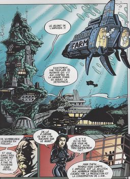 remarques: | premier et unique volume de la série qui ne fut pas continuée dans cette période futuriste, l'air est devenue une denrée extrèmement rare, mais l'homme des cités sous globe a besoin de lui pour continuer à exister, seulement sa production et sa commercialisation sont aux mains de groupes puissants et la vie du peuple dans les cités submarines n'est pas une partie de plaisir >> p. 4 les manifestations sont réprimées par noyade! tandis que le lieutenant Bama, une femme, enquête sur le trafic de drogues >> p. 21 le grand conseil d'administration des cités sous globe décide d'explorer les grands fonds le lieutenant Bama est chargé de former une équipe pour cette expédition mais une bande de malfrats dirigée par la pieuvre rouge s'apprête à infiltrer les membres de l'expédition pour avoir aussi sa part au gâteau l'engin mis à disposition pour l'exploration sera appelé l'orque d'acierl >> des fusillades, des explosions et des bagarres à gogo forment le menu principal d'un graphisme plutôt grossier avec un scénario très peu recherché |