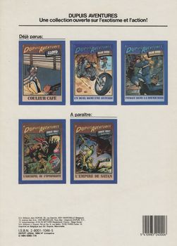 remarques: | fait partie de la collection Dupuis Aventures, une collection ouverte sur l'exotisme et l'action! dont les trois premiers albums - tome 1 Loyd, couleur café, Dupuis 1983 - tome 2 Blue Bird, un duel dans une guitare, Dupuis 1984 - tome 3 Blue Bird, twiggy dans la souricière, Dupuis 1984 ainsi que la suite: - tome 6 Kogaratsu, le mont au lotus de sang, Dupuis 1985 - tome 7 Alain Brisant, SOS bagarreurs, Dupuis 1985 - tome 8 Vincent Murat, comme un animal en cage, Dupuis 1985 - tome 9 Kogaratsu, le trésor des Etas, Dupuis 1986 seuls les tomes 4 et 5 avec Brice Bolt sont collectionnés ici n.b Brice Bolt est un Marc Dacier intérimaire parce que Eddy Paape, co-auteur du personnage, a quitté Dupuis pour le Lombard avec un contrat d'exclusivité pour le Lombard, Charlier chez Dupuis n'a donc pas pu reprendre le personnage de Marc Dacier et a inventé Brice Bolt, un nouveau personnage similaire à Marc Dacier, graphisme effectué par Artur Puig, un dessinateur espagnol qui avait jusqu'alors réalisé des récits de guerre pour les maisons anglaises Thompson et Fleetway Brice Bolt, journaliste au journal Eclair et Deferre, son concurrent au journal le Clairon, entendent parler de phénomènes paranormaux sur une île inconnue du Pacifique ils décident de s'y rendre mais de curieuses menaces de mort se manifestent déjà avant leur départ et lors d'une étape au Managua, Brice Bolt est déjà arrêté comme terroriste par le régime dictaturial du pays, il sera délivré par Deferre qui a fait alliance avec les rebelles du régime après avoir quitté en catastrophe le Managua, Brice et Deferre louent une goëlette pour se rendre à l'archipel Rotuma mais avant leur arrivée, ils doivent encore réprimer une mutinerie sur leur navire, arrivés finalement à Rotuma, nos deux héros sont confrontés avec une population qui a subi une invasion de crabes géants >> p. 41 la pince d'un crabe avec 2.- m d'envergure ces monstres viendraient d'un atoll maudit, la suite dans le prochain album "l'empire de Satan" >>> aventure à la Charlier avec un grand A, un scénario plus ou moins banal mais clair et concret avec un graphisme qui pourrait être un peu plus recherché mais qui correspond bien au genre du récit |