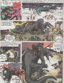 remarques: | la suite des aventures fantasmagoriques du grand reporter Brice Bolt le commando organisé par les deux journalistes arrivent sur une île où des indigènes canaques préparent un sacrifice humain pour honorer un monstre qui vit dans leurs eaux, >> p. 8 en l'occurence une pieuvre géante les canaques seront mis en déroute et la pieuvre supprimée grâce à une torpille fabriquée en amateur par le journaliste Deferre continuant leur voyage vers l'atoll maudit (l'empire de Satan), le goëlette du groupe est attaqué par >> p. 14/15 un espadon géant qui sera anéanti grâce à des grenades lancées du bateau mais celui-ci coulera quand même et nos amis doivent rejoindre l'atoll avec un canot de sauvetage, toutefois en examinant les restes de l'espadon, nos amis découvrent qu'il a été téléguidé par des électrodes fixés dans sa tête arrivés sur l'atoll, ils constatent que celui-ci est en fait un ancien cratère qui n'est plus actif, ils décident d'explorer le cratère, mais en chemin, ils sont agressés de nuit par des chauve-souris géantes et de jour par des fourmis géantes finalement, ils seront sauvés par un ascenseur qui les emporte dans l'intérieur du cratère où ils sont reçus par deux savants nazis, le dr Satan et son compagnon le dr Mengele, aidés par de nombreux hommes armés, ces savants, grâce à des radiations solaires, ont réussi à fabriquer des monstres qui sèment la terreur dans les environs et qui sont destinés à conquérir le monde >> p. 35 une prison plutôt confortable toutefois, grâce à l'aide de April Allen, l'assistante du dr Satan qui ne veut plus travailler pour les savants fous, le groupe réussit à quitter l'empire de Satan après avoir provoqué une explosion qui détruit complètement l'île maudite de retour à la maison, les deux journalistes raconteront leur histoire qui ne sera pas prise au sérieux par les rédacteurs de leurs journeaux >>> bon, le scénario de Charlier est toujours du genre grande envergure mais reste clair et concret bien que l'intrigue est un peu grosse et d'un genre assez connu, le graphisme de Puig restant acceptable |