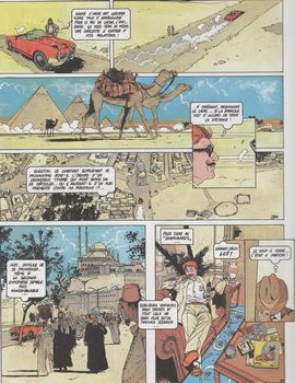 remarques: | deuxième album de la série, un troisième album a paru: tome 3 la mort dans l'île aux éditions Helyode 1995 mais non collectionné ici Graeme Donnington termine une croisière sur le Nil et se prépare à un séjour en Egypte chez une vieille connaisance, mais là, il trouve porte close. flairant une affaire louche, il va commencer une enquête qui va l'entrainer dans une situation dangereuse, en effet, il va déranger certaines personnes et de ce fait va devenir bien gênant! >> p. 7 clin d'oeil au Mortimer de la Grande pyramide: le célébrissime "Shepheard's hotel" cette fois, c'est le meurtre d'une ancienne connaissance, K.H. Wörms, au lac Korun qui provoque l'enquête de Graeme Donnington >> p. 12-16 flash back sur un épisode de la guerre du désert durant la 2ème guerre mondiale où Donnington a fait la connaissance du lieutenant Wörms >> p. 24 Donnington est vraiment un mauvais conducteur finalement, Donnington découvrira les agissements d'une ancienne mata hari qui aura voulu éviter un scandale concernant une affaire d'espionnage >>> du roman policier de série B en bande dessinée, une aventure toute simple ou un homme a pris la place d'un autre, ajoutez à cela une jeune veuve sensuelle et mystérieuse et cela entraine des situations embrouillées et c'est dans ce panier de crabe que notre écrivain Donnington va mettre les pieds, un héros parfois naif et qui se jette souvent dans la gueule du loup, quant au graphisme de Delitte, il n'a pas encore trouvé sa vitesse de croisière mais on distingue déjà de çi de là, quelques fines illustrations, notamment en p. 4 pour les navires et en p. 24 et 42 pour les voitures |