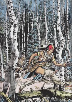 remarques: | constitué de cinq romans dont le très célèbre "dernier des Mohicans", le cycle de Bas-de-Cuir (leatherstocking) raconte l'aube américaine, déchirée par la guerre franco-anglaise et par les luttes des tribus indiennes ralliées à l'un ou l'autre camp, cet album: le tueur de daims (the deerslayer) écrit en 1841 en est le Ier des 5 volumes écrits par Cooper la "saga de Bas-de-Cuir" est l'adaptation (la plus scrupuleuse possible dans l'esprit et la lettre), des cinq romans de James Fenimore Cooper, en 6 tomes de bande dessinée n.b. existe aussi en tomes doubles (1 et 2, 2 et 4, 5-6) aux éditions Varou 2018 en cinq épisodes de vie, de l'adolescence à la vieillesse, est décrite la destinée de Nathaniel Bumppo, alias tueur-de-daims, oeil-de-faucon, pathfinder et Bas-de-cuir Natty Bumppo, orphelin blanc, a grandi dans les forêts en amitié avec les mohicans dans le sauvage et superbe Nouveau Monde des années 1760, près du lac Otsego, le jeune homme apprend les lois de la vie et celles de la chasse aux cotés de Chingachgook, "le grand serpent", son ami mohican le plus fidèle, il apprendra vite aussi les dures lois de la guerre que les Indiens, Delaware, Iroquois ou Mohicans, les colons et les troupes françaises qui tiennent les forts, ne cessent de se combattre les uns aux autres, Natty deviendra "le tueur-de-daims", mais aussi, d'aventure en aventure, courant les pistes, des Appalaches à la frontière du Canada, le plus fameux héros des romans de Cooper, surnommé "bas-de-cuir", homme libre blanc qui a fait siennes les vertus indiennes, au début de la conquête de l'Amérique par les anglais et les français, la concurrence, euphémisme pour une véritable guerre, fait rage entre les deux camps, pour les aider dans leurs manoeuvres et dans l'exploration du territoire, les deux partis se sont alliés avec des tribus indiennes, les français, qui n'ont pas vraiment le beau rôle dans ce récit, avec les hurons, branche du peuple iroquois, les anglais, ce sont les héros..., avec les delawares, branche du peuple mohican, un jeune homme blanc, mais élevé par les Delawares, après la mort de ses parents, surnommé deerslayer (tueur-de-daims) du fait de sa grande adresse au tir à la carabine, accompagné par son ami Chingachgook, un chef delaware, appelé grand serpent s'est donné pour mission de délivrer la fiancée de ce dernier, Hist, détenue par les guerriers hurons intitulé dans l'album le tueur de daims (deerslayer) avec son compagnon l'indien Chingachgook, appelé grand serpent, l'action se déroule près du lac de Cristal (Glimmerglass) vers 1740 et met en prise des combats contre Rivenoak, chef des indiens hurons résumé Harry March (appelé Hurry par les indiens) avec son ami le tueur de daims sont à la recherche du château de vieux Tom Hutter sur la lac de Cristal ils y rencontrent les deux filles de Tom: la belle Judith et l'innocente Hetty >> p.10 ma famille se nommait Bumppo et mon nom de baptême est Nathanaël, j'ai été adopté et élevé très jeune par les delawares qui nomment les leurs suivant leurs qualité ou défauts quand j'étais un enfant chagriné de la perte de mes parents, ils m'appelaient "oreille basse" maintenant comme je suis un bon chasseur, ils me surnomme tueur-de-daims (comme expliqué par le tueur-de-daims; attaqués par les indiens Mingos, ils se réfugient sur le château >> p. 20/21 les démêlés de tueur-de-daims avec le Mingo (branche des hurons) qui le surnomme oeil-de-faucon de par sa grande adresse à la carabine (il sera aussi surnommé "longue carabine") Harry et Tom Hutter, capturés par les Mingos, tueur-de-daims veut mettre les deux femmes en sécurité, il est rejoint par chingachgook, chef delaware, appelé grand-serpent qui veut délivrer sa fiancée, prisonnière des hurons grâce à du troc, tueur-de-daims réussit à faire libérer Tom Hutter et Harry mais lors du sauvetage de Hist, >> p.48 le vieux Tom Hutter se fait scalper et en meurt tandis que le tueur-de-daims qui est appelé maintenant oeil-de-faucon se fait capturer par les mingos la suite dans le tome 2 >> une adaptation assez fidèle du roman de Fenimore Cooper, mais le lecteur doit aussi s'adapter aux nombreux noms et surnoms! avec quelques belles illustrations dont certaines pleine page, une jolie couverture d'album et des pages de garde bien réussies annexes - couverture de l'album - page de garde - illustration pleine page information l'ensemble de ce récit se passe sur un lac tranquille des Etats-Unis, proche de la frontière du Canada, sur ce lac vivent Thomas Hutter et ses deux filles: Judith et Hetty, leur mère est décédée deux ans avant le début de cette histoire, mais son éducation contrastait étrangement avec celle du père, Judith a reçu l'intelligence et le goût des parures de sa mère, tandis qu'Hetty n'est pas attirée par le luxe, est simplette et aime parler en prenant exemple sur la Bible, tout se passe bien jusqu'à ce que la France et l'Angleterre entre en guerre l'une contre l'autre, les alliés français, les hurons, se trouvent près du lac lors de l'annonce, ils essayent dès lors de nuire aux anglais vivant sur leur arche, pendant ce temps, un ami de la famille, Harry March fait la route vers le lac en compagnie de deerslayer et un delaware et donc allié aux anglais, le premier est un bon raciste colonial considérant les "peaux rouges" comme des animaux et venant braconner dans la zone, voir prendre quelques chevelures deerslayer (tueur-de-daims) lui, est venu sur le sentier de la guerre, c'est un homme blanc élevé par les blancs mais aussi par les delaware, il semble avoir pris les meilleures parties morales des deux mondes et est un grand modèle de vertu, il se dirige vers le lac pour rejoindre l'un de ses chefs et ami: Chingachgook ce dernier est un delaware de la tribu des mohicans Mohican, il s'est réfugié chez les delaware après l'extinction de sa propre tribu, avec deerslayer, il compt