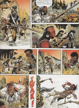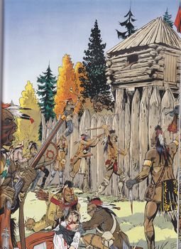 remarques: | le lac Ontario (the pathfinder) écrit en 1840 est le volume 3 de la saga de Bas-de-Cuir l'épopée d'un chef indien, d'une jeune fille venue rejoindre son père, en poste dans un fort britannique, et un guide, pendant la guerre entre les français et les anglais. près du lac Ontario, les batailles entre français et anglais font rage, un conflit auquel les tribus indiennes se sont mêlées afin de reconquérir des territoires perdus, originaire de Boston, Mabel Dunham est venue rejoindre son père, officier en poste dans un fort britannique, mais sur le chemin qui mène au lac Ontario, Mabel fait la connaissance du guide œil de Faucon, surnommé pathfinder par les anglais, et du chef indien Chingachgook qui eux aussi se rendent au fort, ils veulent soutenir les soldats britanniques en mauvaise posture, en chemin, Pathfinder finit par tomber amoureux de Mabel et espère obtenir de son père l'autorisation de l'épouser, mais le destin en décidera autrement le lac Ontario à travers lequel un fort français et un fort anglais se font façe tueur-de-daims, appelé maintenant oeil-de-faucon, longue-carabine par les indiens et pathfinder par les anglais, accompagné par Chingachgook, appelé grand serpent et par le jeune Jasper appelé "eau douce" est chargé de convoyer la jolie Mabel, fille du sergent Durham, à fort Oswego >> p. 7 le passage des cataractes >> p. 22 le concours de tir à la patate >> p. 30/31 pris dans la tempête du lac Ontario arrivés au fort, les anglais doivent encore subit l'assaut des indiens, mais grâce à Chingachgook, parti chercher du renfort, un détachement écossais arrivé à la rescousse mettra les indiens en fuite >> un épisode un peu plus banal dans cette saga avec toutefois des illustrations toujours de bonne qualité |