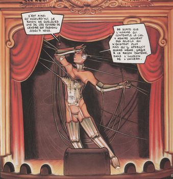remarques: | récit sado-fantastico lors d'une croisière sur "la ville d'Alger", un vaisseau spatial de plaisance >> p. 8 "la ville d'Alger" de curieux personnages sont au prise entre eux: le terrien Takila T. , le mystérieux Mosca L. et des cubes insolites (des extra-terrestres?) mais tous sont de la chair à boucherie >>> p. 48 qui se laissent découper au mieux avec des couteaux suisses! >> p. 14/15 de la boucherie humaine "extra" à voir aussi p. 34 le sacrifice des épouses du soleil dont la présence dans cet épisode n'est pas très claire >> ni le scénario ni le graphisme ne sont de grand intérêt, un album fait pour déranger le lecteur avec un scénario de Dionnet dont on n'est pas habitué, quelle différence avec la série d'Arn le conquérant! information Beb Deum taille un dessin sur mesure à la science-fiction troublante de Jean-Pierre Dionnet, à un humour noir et une violence surréaliste, étrange région étrangère où les machines donnent tour à tour souffrances et plaisirs |