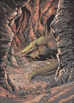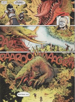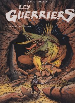 remarques: | troisième volet de cette série plutôt sanglante et violente la population du paisible royaume Hamah vit dans la peur depuis qu'un monstre titanesque est sorti d'un sommeil séculier, c'est cette terre en proie à la malédiction que Talian et ses compagnons, poursuivis par un traqueur acharné, doivent traverser, ils rencontreront sur leur route les puissants Tekuits, intouchables magiciens et maîtres des arcanes, et prendront parti dans un conflit dont l'issue pourrait signifier la fin d'une race, et nul ne peut prédire lequel, de l'acier ou de la magie, sortira vainqueur de l'affrontement après avoir récupéré le livre des Anciens dans la bibliothèque d'Abiti, Talian poursuit sa quête accompagné de Giuba, Mandraï et d'un homme de Kohnâ le Vik pour le guider dans le royaume d'Hamah où un monstre ravage la contrée ailleurs, les Tekuits, dotés de pouvoirs magiques, poursuivent Xures, un fugitif de leur race celui-ci sera recueilli par Talian qui le protègera contre les poursuivants >> p. 21-24 premier combat contre le monstre des cavernes qui est neutralisé par le pouvoir magique de Xures par la suite, Mandraï est empoisonnée et nécessite des soins tandis que Xures, capturé par des villageois du Hamah, va être sacrifié au monstre pour que celui-ci épargne les villageois >> p. 44 le monstre dans son repaire (seule illustration pleine page de la série) Xures sera finalement délivré lors d'un deuxième combat et le monstre rejeté dans son repaire après qu'il ait semé le désarroi chez les villageois prochaine destination: l'île de Gavajo dans la mer sans fond >>> ce troisième tome présent un interlude dans la quête de Talian, on y découvre en plus de détail, la race des tekuits et Talian laisse de côté momentanément sa quête pour aider à sauver un jeune fugitif tekuit, le scénario n'a rien de particulier et le graphisme ne change guère par rapport au précédant album, mais reste acceptable; un album monstrueux consacré à un genre de dragon monstrueux! |