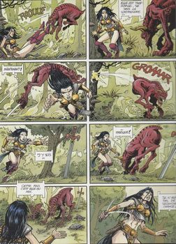 remarques: | la guerre du talion a sonné le glas de l'empire humain, le plus grand et le plus puissant que Kelhîn ait connu, la race des hommes a été pourchassée et exterminée cinq siècles après, il ne reste que quelques clans humains parqués dans des réserves, mais un guerrier, Talian, héritier de l'art ancestral du combat, refuse de laisser s'éteindre son peuple, après avoir cherché une femelle fertile pour perpétuer son peuple, il lui faut trouver une terre libre sur laquelle pourra prospérer sa tribu, avec ses compagnons d'aventure, Min-Draï et Xures, il va parcourir Kelhîn à la recherche de cette contrée sur laquelle repose tous les espoirs d'une nouvelle nation humaine l'empire de Salens, avec ses territoires vierges, semble le plus à même d'accueillir ce peuple sans pays, toutefois Talian et ses amis arrivent à un bien mauvais moment, l'empereur est mourant, les nobles se disputent la succession et une rébellion menace d'embraser le pays une fois de plus, Talian devra se tailler un chemin à la puissance des armes et forcer le destin Talian et ses amis interviennent dans un combat et sauve la vie d'un curieux enfant, l'enfant est conduit au château de la baronne Sikda qui l'accueille comme son fils, puis le trio se rend à Uyart, la capitale de Salens, pour rencontrer l'empereur Oshq >> p. 11 la cité d'Uyart à l'atmosphère un peu lourde l'empereur est mort, les nobles de la cour ont des vues sur sa succession alors que des rebelles s'efforçent aussi de prendre le pouvoir capturée par les rebelles, Min-Draï réussit à gagner leur confiance et à démasquer un traître parmi eux tandis qu'à Uyart, le désordre règne et c'est la baronne Sidka qui prend le pouvoir mais les rebelles menés par Talian et ses amis vont abroger la tyrannie et s'emparer de l'enfant Jahtsi qui représente le symbole du pouvoir et après avoir renversé l'ex-impératrice Sidka et rétabli la justice dans Uyart, le trio reprend sa quête >> un scénario peu passionnant mais acceptable, tout comme le graphisme repris par Tierr, qui se diffère totuefois quelque peu de celui de Pellet (un trait moins fin) mais qui reste respectable information "le trône de Salens" annonce le départ de Pellet qui décide de se consacrer uniquement à la série "Les Forêts d'Opale" avec Arleston, et aussi une suite qui commence à s'essouffler, Latil doit avoir des remords que de ne pas avoir clos la série au tome 4: "le crépuscule des hommes" en fait ce n'est pas du tout le changement de dessinateur qui choque, mais c'est plutôt le changement de qualité de la série, cet effet est, il est vrai, produit par l'arrivée de Tierr toutefois c'est aussi une suite qui n'aurait pas due être et qui fait errer nos personnages on ne sait que trop où.. |