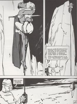 remarques: | du fantastique érotique, paru dans le périodique A Suivre, Gully Traver se réveille un jour sur une plage déserte, une histoire de plage avec phantasmes érotiques et poétiques >> p. 32 les yeux dans le noir mangent le ventre du soir >> p. 42 les rideaux d'amour cachent les lits d'un jour - s'en suit des châteaux de sable bien aménagés, une visite dans une chapelle, un peu de bondage pour changer, des canapés à fleurs, une histoire de chiens et des sables mouvants >> p. 67 une pleine page de plage vide mais avec une mer houleuse et pour finir, la ballerine sortie du sable (dessin de la couverture d'album) >> un récit plutôt vide de bon sens, surtout des illustrations de plage sans grand intérêt sauf peut'être celles de la ballerine sortant du sable annexes - couverture de l'album dégageant une transfiguration graphique particulière - diverses illustrations |