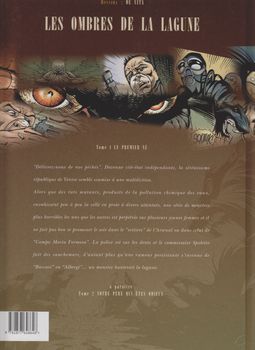 remarques: | tome 1 le premier né de la série les ombres de la lagune, il n'y aura pas d'autres albums alors que le titre annoncé du prochain album était "notre père qui êtes odieux" Venise en l'an 2017 est un état autonome où règne toutefois le désordre et une grande pollution, des rats mutants ont envahi les bas quartiers et un mystérieux alien s'est établi parmi les rats à la suite d'une chasse à l'homme, deux policiers se retrouvent cernés par les rats et dévorés par le monstre qui, entre autre, s'en prend aussi à de jeunes femmes en les laissant dans un état très "charcuté" >> p. 16 la promiscuité des rats dans toute la ville >> p. 18 l'équipe de dératisation >> p. 40 façe à l'alien et pour éliminer l'alien et ses rats, les équipes de nettoyeurs auront encore bien du rat sur la planche >> dernière page, l'espérance du commissaire Spolettole avec un Pater spécial: "notre père qui êtes odieux..." >> un album typiquement gore, peut'être un peu "raté" mais qui aurait pu avoir un bon développement si Corteggiani se serait donné un peu plus de peine, quant à De Vita, rien à redire, le graphisme est bon sans être sublime avec une couverture d'album bien exécutée les oeuvres de a) Corteggiani François (entre autres): de silence et de sang, le casque et la fronde, Francis Falco, il participe aussi à la série Jeunesse de Blueberry b) De Vita Giulio (entre autres): décalogue tome 2, Thorgal Kriss de Valnor, Wisher et Quintett |