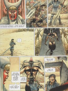 remarques: | à noter au début de l'album: un carnet d'esquisses avec une introduction des personnages de la série rétrospective dans la combe des loups vivent des démons de la race Hailagmannuz qui est dirigée par un triumvirat dont Kzyl-Orda qui détient la Roussotte comme esclave, elle réussira à s'enfuir (voir début tome 1) avec ses deux enfants et en emportant le livre sacré Mystrisark, le chef démon envoie alors la muette à la poursuite de la Roussotte après avoir sauvé Marie de son frère démon, Guillaume de Baubreuil et Kubilaï Har Es Nur la conduisent en lieu sûr, au plus profond de la forêt auprès de Gaston, le vieil herboriste, quant au triumvirat des Hailagmannuz, il ne peut accepter qu'un humain ait terrassé l'un des leurs, il charge un de leurs démons à empoisonner et droguer Guillaume qui se retrouve chez les Hailagmannz où il est soumis à leur jugement >> p. 24 le duel de Guillaume avec le gladiateur démoniaque alors que Marie plonge dans la folie, laissant libre cours à ses pulsions démoniaques, c'est le moment choisi par une étrange jeune guerrière pour prêter main-forte à Guillaume, en fait c'est le fantôme de la Roussotte tandis que Kzyl Orda abandonne la muette et reprend Marie sous sa domination dernière épreuve pour Guillaume, il doit soulager les souffrances de la Roussotte pour la renvoyer définitivement dans le monde des morts >>> un récit qui ne convainc pas vraiment, tout y est confusion et mélange démoniaque sans connaître exactement le but de l'histoire, seul le graphisme est de quelque intérêt |