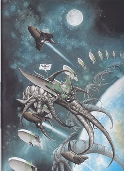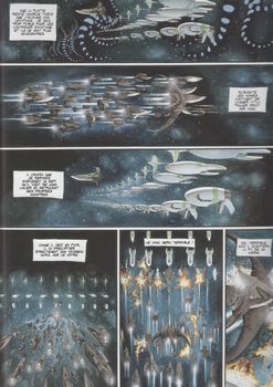 remarques: | un quatrième album qui ne surpasse les autres qu'en médiocrité, toutefois une planche bien réalisée en début d'album (voir annexe) Attila, le roi des Huns, a enfin obtenu les coordonnés stellaires secrètes de Rome, la planète capitale de l’Orbis romain galactique, enfin, il va pouvoir la ravager et devenir le maître de l’univers, il deviendra l’égal d’un dieu, il n’y a plus qu’un obstacle devant lui: le patrice Aetius sous le casque duquel se cache son amante disparue, l’immortelle incarnation de la déesse du Chaos, alors, face à face, dans une bataille spatiale qui dépasse tout ce que l’homme a déjà connu, la flotte impériale et la horde des Huns vont se combattre jusqu’au triomphe ou au massacre final, mais les dieux eux-mêmes peuvent-ils maîtriser leur destin quand tout semble prouver que c’est bien une tragédie écrite depuis des millénaires qui se rejoue à l’échelle cosmique? petit résumé Valentinien s'est temporairement réconcilié avec ses alliés romains, >> p. 11 à 17 un grand combat galactique s'engage (les champs catalauniques galactiques de l'espace), Aetius en sort vainqueur, mais le destin de Rome n'est pas encore sauvegardé + en fin d'album un cahier de croquis en 6 pages sur la louve romaine >> un album à nouveau désolant dans le vide galactique qu'est cette série |