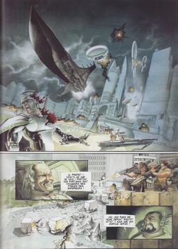 remarques: | il existe un 6ème et dernier album de la série: tome 6 Exit (Soleil 2006) mais non collectionné ici Rome a emporté la bataille, les Huns, les sauvages barbares, ont été massacrés, Flavia Aetia a vaincu leur roi, Attila, mais l’empereur, à peine victorieux, a eu peur de devoir affronter ceux qui pourraient bien être deux divinités, sans hésiter, il les fait jeter au cœur même du soleil, mais peut-on tuer des humains devenus dieux ? l’empereur a commis la trahison de trop, déjà le préfet Avitus et le barbare Ébarse, les compagnons de Flavia, se soulèvent contre cette injustice, et si tout cela avait été en fait prévu de longue date par des êtres encore plus cruels et cyniques que les empereurs? pour Flavia et Attila, l’heure est venue de tout découvrir de leur passé et de ceux qui les ont créés et manipulés petit résumé les enfants prodigues sont de retour parmi les dieux, petite dissertation sur l'empire romain du passé: il y a 3000 ans, les savants de l'époque avaient compris en étudiant l'histoire et les probabilités d'avenir que l'empire mettait en danger l'existence de l'humanité, Rome avait écrasé les autres civilisations non par ses armes, mais par ses idées et son mode de vie oisif, sans ennemi, sans challenge , la romanité, restée seule civilisation, ne pouvait plus connaître d'évolution culturelle et sociale, elle était condamnée à mourir lentement n.b. et en fait, l'empire romain périt de par son oisivité et son anarchie en déclanchant la catastrophe des invasions barbares à Rome galactique, c'est la guerre civile qui éclate et cela devient aussi maintenant une affaire entre les dieux et les humains, le préfet prend le pouvoir et l'impératrice sacrifie le petit empereur Valentinien >> p. 33-35 le jardin zoologique galactique >> un avant-dernier album qui ne vaut vraiment pas pipette malgré leurs titres pompeux en latin, le dernier album ne sera pas collectionné ici, le texte de ce tome 5 est toujours aussi incohérent qu'au début de la série,on reprend des passages du passé antique, mais sur une autre dimension, un graphisme qui ne s'améliore guère avec une orgie et un chaos de couleur, mais sans aucune prétention |