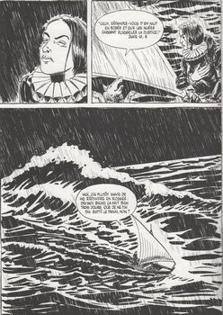 remarques: | la suite des aventures loufoques de la bouchère >> p. 6 les papes à poux et les papes pas à poux (jeu de mots tout comme les papoux papas sans poux) la bouchère réussit à semer ses poursuivants et parvient à s'introduire à Tordesillas, capitale de l'Inquisition, mais découverte, elle est capturée et emprisonnée, elle est menée au bûcher, toutefois le destin ne permettra pas qu'elle soit brûlée et un orage tombe bien à propos pour éteindre le bûcher, elle sera délivrée par les ennemis de l'Inquisition puis ce sera une tempête qui la conduit à nouveau au début du premier tome >> un récit toujours parfaitement absurde mais dont le graphisme N&B convient assez bien à ces aventures loufoques |