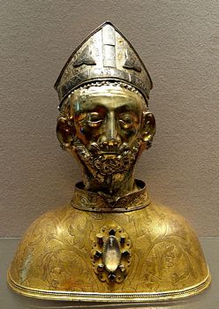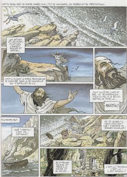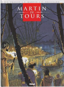 remarques: | 356, dans les Alpes, Catianus raconte l'histoire de son ami le tribun Martinus, fils de tribun et soldat dès l'âge de quinze ans, un jour, alors qu'il combat les Francs en Rhénanie, Martin quitte l'empereur César Julien afin de vivre sa foi, il luttera contre les évêques qui ne cherchent que pouvoir et richesses, le combat de Martin sera long et riche en actes héroïques, il devient un soldat du Christ, en route pour la Pannonie, il domestique un ours et deviendra célèbre pour se faire l'ami des animaux sauvages puis il se rendra à Rome et passera 4 ans de méditation sur une petite île italienne >> p. 16 le pauvre hère avec un pilon à qui Martin, tribun, cède la moitié de son manteau à Tours (en latin d'abord Caesarodunum puis Turonorum), Martin devient un saint homme, il est appelé le XIIIème apôtre du Christ et devient aussi un guérisseur réputé en 372 il devient evêque de Tours, à sa mort en 397, Sulpice Sévère publiera la vie de St-Martin n.b. Saint Sulpice-Sévère (Sulpicius Severus), né en Aquitaine vers 363 et décédé au cours du premier quart du Vème siècle, est un chroniqueur et un ecclésiastique de langue latine >> une histoire de saint mais sans panache ni pour le texte ni pour le graphisme; il existe un deuxième tome dans cette série, de même date 1996: le XIIIème apôtre mais non collectionné ici à noter que Saint-Martin devint le patron de plusieurs villes: Rivière-au-Renard (Québec), de Vevey (Suisse), de Buenos Aires, de Mayence, d'Utrecht et de Lucques, c'est aussi une île des Caraïbes et désigne aussi la fête gastronomique de la St-Martin en Ajoie (Jura) annexes - couverture de l'album - reliquaire de la tête de St-Martin vers la fin du XIVe siècle - fresque de St-Martin - une page de l'album Information Saint Martin de Tours, aussi nommé Martin le Miséricordieux, ou encore Saint-Martin des Champs (qui a donné lieu à appellation de différents édifices religieux), né dans l'Empire romain, plus précisément à Savaria, dans la province romaine de Pannonie (actuelle Hongrie), en 316, et mort à Candes, en Gaule, le 8.11.397, est l'un des principaux saints de la chrétienté et le plus célèbre des évêques de Tours avec Grégoire de Tours sa vie en partie légendaire est essentiellement connue par la Vita sancti Martini (vie de saint Martin) écrite en 396-397 par Sulpice-Sévère, qui fut un de ses disciples, la dévotion à Martin se manifeste à travers une relique, le manteau ou la chape de Martin qu'il partage avec un déshérité transi de froid dès le Vème siècle, le culte martinien donne lieu à un cycle hagiographique, c'est-à-dire à une série d'images successives relatant les faits et gestes du saint il introduit le monachisme en Gaule moyenne, le monachisme martinien s'ancrant autour de la Loire tandis que les monachismes lérinien et cassianite se développent dans la Gaule méridionale son culte se répand partout en Europe occidentale, depuis l'Italie, puis surtout en Gaule où il devient le patron des dynasties mérovingiennes et carolingiennes affecté en Gaule, à Amiens, un soir de l’hiver 334, il partage son manteau avec un déshérité transi de froid, car il n’a déjà plus de solde après avoir généreusement distribué son argent il tranche son manteau ou tout du moins la doublure de sa pelisse: le manteau appartient à l'armée, mais chaque soldat peut le doubler à l'intérieur par un tissu ou une fourrure à ses frais, la nuit suivante le Christ lui apparaît en songe vêtu de ce même pan de manteau, il a alors 18 ans, le reste de son manteau, appelé "cape" sera placé plus tard, à la vénération des fidèles, dans une pièce dont le nom est à l'origine du mot chapelle, en 371 à Tours, l’évêque en place Lidoire vient de mourir; les habitants veulent choisir Martin mais celui-ci s’est choisi une autre voie et n’aspire pas à l'épiscopat, les habitants l’enlèvent donc et le proclament évêque le 4 juillet 371 sans son consentement; Martin se soumet en pensant qu’il s’agit là sans aucun doute de la volonté divine mais même s’il est évêque, il ne modifie en rien son train de vie, il crée un nouvel ermitage à 3 km au nord-est des murs de la ville: c’est l’origine de Marmoutier avec pour règle la pauvreté, la mortification et la prière les moines doivent se vêtir d’étoffes grossières sur le modèle de saint Jean-Baptiste qui était habillé de poil de chameau, ils copient des manuscrits, pêchent dans la Loire; leur vie est très proche de ce que l’on peut lire dans les Évangiles sur la vie des premiers apôtres, jusqu’aux grottes qui abritent dans les coteaux de la Loire des habitations troglodytes où s’isolent des moines ermites, le monastère est construit en bois; Martin vit dans une cabane de bois dans laquelle il repousse les "apparitions diaboliques et converse avec les anges et les saints", c’est une vie faite d’un courage viril et militaire que Martin impose à sa communauté |