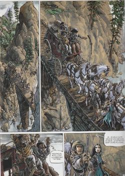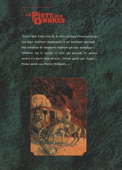 remarques: | le monde était devenu mauvais, c'est pourquoi le "donneur de vie" a provoqué le déluge Texas, 1866, cette nuit-là, le vieux Zachary Cloverleaf (feuille de trèfle) et ses cow-boys, incapables de contenir la folie de leur troupeau, assistent impuissants à un terrifiant spectacle: un millier de longhorns engloutis en un instant par une montagne... quelques années auparavant, Cloverleaf, alors capitaine des Texas Rangers, recueillait le jeune Natanaël Dumont, unique survivant du massacre de sa famille lors de la révolte des Comanches Kwahadis, en s'enfuyant, l'enfant était tombé dans un puits fraîchement creusé, il y trouva trois pierres étranges qu'il garda précieusement en souvenir de cette nuit tragique, il ignorait que ces pierres renfermaient l'esprit des "Gahe" = puissantes divinités selon les légendes indiennes, et malheur sur le monde si celui qui possède les pierres sacrées n'a pas le coeur en paix, prenez garde alors aux "pierres brûlantes" puis c'est la guerre de Sécession, les Texas Rangers combattant dans les rangs des Confédérés, Zachary Cloverleaf confie Natanaël aux bons soins du ranchman Cumberland, de retour de la guerre, Zachary retrouve Natanaël qu'il considère comme son propre fils et lui enseigne le maniement des armes >>p. 20 le revolver à percussion à 9 coups mais avec un 10ème coup, caché dans le canon du dessous, bourré de chevrotines et à 5 mètres, c'est le coup qui ne pardonne pas sur le point de partir pour le grand trial des longhorns à Abilène, Natanaël s'enfuit avec Julia, une jeune femme qui a abattu Cumberland après s'être fait violer par celui-ci Zachary part à leur poursuite, mais les deux fugitifs sont protégés par les 3 pierres brûlantes qui, si on leur demande, provoque l'arrivée des "Gahe" pour éloigner tout danger >> p. 30+40 les esprits de la montagne qui veillent sur Julie et Natanaël le vieux Zachary y laissera la vie, mais conseillera avant de mourir à Natanaël de ne pas utiliser les "Gahe" pour faire le mal >> du western fantastique mais aussi romantique avec un bon graphisme et un texte intéressant |