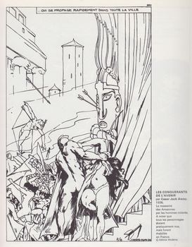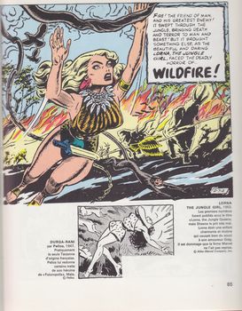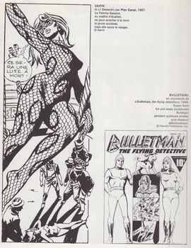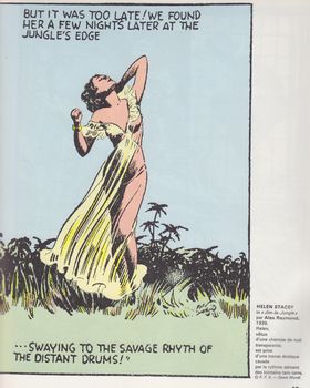 remarques: | album l'enfer des bulles, cartonné, avec jaquette, 250 pages, en partie couleur et en partie N&B y compris le feuillet publicitaire sur l'enfer des bulles Introduction - la femme joue un rôle de premier plan dans la bande dessinée grâce aux possibilitées érotiques, cet album présente un panorama critique des principaux héroïnes - début timide jusqu'en 1930 avec la plus célèbre de cette époque: Dixie Dugan en 1929 (avec les traits de Louise Brooks, la star), évolution dans les années 1934 à 1938, puis les bandes "sexy" se développent jusqu'en 1954, date à laquelle la censure commence à sévir les principales techniques de la bande dessinée (exemples en page 7): - bande journalière à 4 images = daily comic strip - bande hebdomadaire en couleur = Sunday comic strip - magazine mensuel complet = comic book 1/ les fiancées éternelles, parmi les plus célèbres: - Dale Arden (Camilla) dans Flash Gordon (1936-1940) - Princess Narda dans Mandrake (1934-1938) - Diana Palmer dans the Phantom (1936-1940) - Lois Lane dans Superman (1938-) et Wilma dans Buck Rogers, Honey Dorian dans Rip Kirby, Ooola dans Alley Oop, Wanda dans Donald Dixon, mais aussi Minnie dans Mickey, Daisy dans Donald et Kitty dans Felix furent aussi d'autres héroïnes non moins célèbres - l'histoire des mariages toujours différés afin d'entretenir l'objet érotique et toujours vierge: la fiancée héroïnes illustrées: - Dale Arden, Lura, Aura, Fria et Marla by Alex Raymond et Dan Barry (1935 et 1952) dans Flash Gordon - Azca queen of Tlascala, Lamak Mayta et Rota by Clarence Gray (1937) dans Brick Bradford - Allura et Wilma by Dick Calkins (1930) in Buck Rogers - Wanda by Carl Pfeuffer (1936) in Don Dixon - princesse Narda et dr. Florel, la reine du royaume des merveilles by Phil Davis (1935) in Mandrake - Diana, Palmer et Gloria by Ray Moore (1936) in the Phantom - Helen Stacey by A. Raymond (1939) in Jungle Jim - Lily de Vrille by A. Briggs (1946) in Jungle Jim - Betya, Honey Dorian et Pagan Lee by A. Raymond (1948) in Rip Kirby - Mouna by A. Canale (1946) in Amok - Dinah by Ray Gotto (1952) in Ozark Ike - Brandy and Lady Mist by Frank Robbins (1946) in Johnny Hazard - Ooola et Eedy by V.T. Hamlin (1939) in Alley Oop - Dolly Devere et Plaster of Paris by Will Eisner (1941) in the Spirit - Lois Lane by Joe Shuster (1952) in Superman - Bandy Muffet by Ray Bailey (1945) in Bruce Gentry - Olive Oyl by Segar (1949) in Popeye 2) les Minettes - l'histoire des jeunes filles dont l'occupation principale était de laisser entrevoir les charmes de leur anatomie, première héroïne avec "sex-appeal" = Betty Boop (1930), mais il fallut attendre 1945 pour que ce genre se développe vraiment avec "miss Lace" by Milton Caniff héroïnes minettes illustrées: - little Annie Fanny by Bill Elder (1965) - Tiffany Jones by Pat Tourret et Jenny Butterworth - miss Torchy Todd (1947) by Bill Ward - Glory Forbes by Bob Hickok (1948) - Lindy by Ernest Ratcliff - Boots by Edgar Abe Martin (1945) - Long Sam by Al Capp+B.Lubbers (1955) - Sapphire Stagg by R.Fradon+C.Paris in Metamorpho (1966) - Fan in Romeo Brown by Jim Holdaway - Paul Temple by MacNamara - Sky Girl by Bill Gibson+R.Webbs (1947) - Isabella by Alessandro Angiolini (1965) - Jane by Norman Pett (1944) - Jenny by Frank Robbins (1958) in Johnny Hazard - Janice Helm by Sy Barry (1965) in the Phantom - Pupa Gey by Mark Rostand (1965) - Françoise Morel by P. Gillon (1961) in 13, rue de l'espoir - Betty Boop by Max Fleisher (1930) - Connie by Frank Gowdwin (1938) - Mary-Jane Watson by John Romita+Don Heck (1968) in Spiderman - Valentina by G. Crepax (1966) in Neutron - Gilda by Jim Landish (1948) in Zago, jungle princess - Loona (1965) in Sadik - miss Lace by Milton Caniff (1945) in Male Call 3) les Tarzannes - contrairement aux héroïnes traditionnelles, les filles de la jungle, à l'exception de deux réputées vierges, avaient des amants avoués et reconnus - Sheena, reine de la jungle (1929) fut la première et la plus célèbre représentante du genre, - Tiger Girl (une vierge) fut une super-tarzanne et la plus jolie de toutes, - Rulah, déesse de la jungle fut peut'être la plus sexuelle et subit les foudres de la censure les tarzannes célèbres illustrées: - Tarzella by Rex Maxon (1940) in Tarzan - Irene Webb by Bob Lubbers (1952) in Tarzan - les amazones by Burne Hogarth (1939) in Tarzan - Sigreda, Jane et Nikotris by Hal Foster (1935) in Tarzan - Jane qui deviendra l'épouse de Tarzan by John Celardo (1963) - Marlene by Russ Manning (1968) in Tarzan - Lilith in Creepy and Mari in last chance by Frank Frazetta (1967) - Sheena by Powell (1942), by Z. Rowich (1942) and by R. Webbs (1947) - Camilla, queen of the jungle Empire by V. Ibsen (1942) - White princess of the jungle by L. Ravelli (1951) - Ann of the jungle (1946) in Kaänga jungle comics - Tiger Girl by A. O'Hara (1945) - Rulah, the jungle goddess by A. Hope (1948) - Skreeta, la vierge folle et Wana, la compagne de Zago by J. Landish (1948) in Zago, jungle prince - Jann of the jungle (1955) - Nyoka by Al Jetter (1950) - Panthère Blonde (1949) - Lorna, the jungle girl (1953) - Durga Rani by Pellos (1947) - princess Pantha by R. Mango (1947) - Cave Girl by Powell (1954) - Luana by L. Cole (1954) in terrors of the jungle 4) les aventurières - l'aventurière, personnage-clé de la littérature populaire, parut assez tardivement - Milton Caniff allait créer le plus parfait spécimen du genre avec Dragon Lady ou Lai Choi San inspirée de Marlène Dietrich, autre aventurière célèbre = Sala chef de gang féminin dans the Phantom ainsi que Connie et Satanik les aventurières illustrées: - Dragon Lady, Burma et Willow Belinda by M. Caniff (1942) in Terry and the pirates - Undercover Girl by O. Whitney (1947) in Manhunt - Sala et Margo by Ray Moore (1936) in the Phantom - Myra North by C. Coll (1938) - Irina by A. Briggs (1929) in agent X-9 - Destiny by F. Robbins (1952) in Johnny Hazard - 