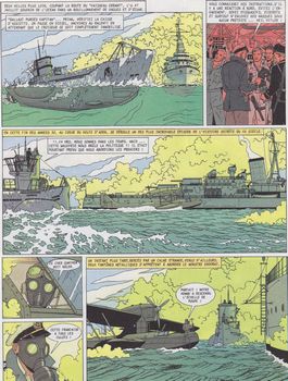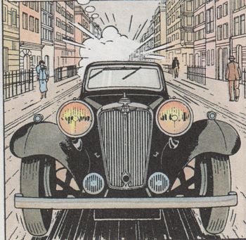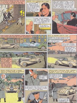 remarques: | les péripéties de Harry Dickson et Tom Wills, cette fois façe à la bande de l'araignée associée avec le IIIème Reich et des dissidents irlandais l'attaque du HMS "Newcastle" de la Royal Navy dans le golfe d'Aden par l'aviation italienne et par un sous- marin allemand à la solde de Georgette qui s'empare des lingots d'or d'une valeur d'un millard de dollars >> p. 4 un aviateur ressemblant beaucoup à Olrik >> p. 15 la demeure de Sir Harold >> p. 17 meurtre où le cadavre disparait puis ce seront des péripéties dans Berlin à la recherche de documents secrets, nos deux amis auront à combattre les SS et la bande de l'araignée après avoir réussi à quitter Berlin à bord d'un Me 110 dérobé à la Luftwaffe, nos deux héros seront encore confrontés à des dissidents irlandais, alliés des nazis et de Georgette, dans le château Donegal, base des "spectres-bourreaux" à nouveau Georgette réussira à s'échapper en sautant dans le vide et tout le monde la croira morte >> p. 18 les agents allemands Schutz et Schultz >> p. 14 à nouveau la fameuse Jaguar de Dickson >> p. 20 une magnifique Maybach-Zeppelin et p. 30 une superbe Delage D6 >> p. 42/43 la légende des spectres bourreaux >> p. 48 où l'on apprend que Georgette Cuvelier est la fille du prof. Flax, un criminel de génie >> un scénario bien monté avec toujours un très bon graphisme annexes - couverture de l'album - extraits de page - gros plan sur la Jaguar Dickson |