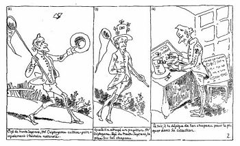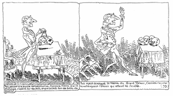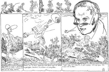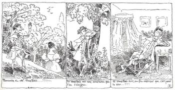 remarques: | titre complet histoires en images par Pierre Horay, album cartonné, grand format, 285 pages, N&B dessins avec texte écrit à la main sous les images 1/ la littérature en estampes by François Caradec - Rodolphe Töppfer né à Genève en 1799 et mort en 1846, essai de physiognomie (1845) par Töppfer où il explique qu'il a trouvé ses maîtres en Angleterre d'où son père lui rapporte des estampes de William Hogarth dont en outre "mariage à la mode" et "Rake's progress" - admirateur de Jean-Jacques Rousseau, Töpffer dessine en 1825 "voyages en zig zag à travers la Suise et l'Italie", Goethe deviendra par la suite un admirateur de Töppfer avec "docteur Festus" (ressemblance avec le dr Faust?) - première histoire en 1827 "monsieur Vieux-Bois", puis en 1829 "dr Festus", suivis de monsieur Cryptogame en 1830, monsieur Jabot en 1831, monsieur Pencil la même année, monsieur Crépin en 1837 et histoire de Jacques en 1844 autres oeuvres inachevées: histoire de monsieur Boissec, histoire de monsieur Vertpré et histoire de monsieur Trictrac - étude de phrénologie (= étude du caractère et des fonctions intellectuelles de l'homme d'après la conformation externe du crâne) et étude de physiognomie - l'un des charmes des histoires de Töppfer, ce sont les légendes qu'il inscrit sous ses dessins 2) Monsieur Jabot (26 planches) - histoire d'un monsieur dans la haute société (essais sur la physiognomie) - monsieur Jabot et ses nombreuses poses (il se met souvent en position) - discussions, danse et débours de monsieur Jabot - case 17: une première dynamique de l'image - les duels de monsieur Jabot >> aventures amoureuses de monsieur Jabot, un peu simplistes mais pas dénuées d'intérêt 3) Monsieur Crépin (43 planches) - histoire d'un bourgeois et de sa famille (son épouse et ses onze fils), problèmes d'éducation et prélude aux Katzenjammer kids - les mésaventures de monsieur Crépin, de son épouse, des deux instituteurs et du phrénologue, monsieur Craniose - satires et critiques contre la société (l'éducation, la peine de mort, la science), le système de procéder du général au particulier >> probablement l'une des meilleures histoires, déjà bien élaborée techniquement 4) les amours de Monsieur Vieuxbois (46 planches) - les aventures amoureuses de monsieur Vieuxbois (genre de Casanova âgé à la poursuite de l'objet aimé) - cet épisode exprime de nombreux sentiments tels que l'espoir, le désespoir et la jalousie >> p. 94 M. Vieuxbois feint de feindre pour mieux dissimuler >> p. 97 M. Vieuxbois devient hermite pour se consoler, mais se rend compte qu'un hermite ne fait pas non plus le bonheur >> p. 103 vignette humoristique >> p. 106 M. Vieux bois change souvent de linge >> une assez bonne histoire rocambolesque (quelque peu similitude avec le baron de Crac ou Münchenhausen) où le dynamisme des images est particulièrement mis en valeur (pages 117 à 120: épisodes avec le rival "Sancé" - p. 97 le graphisme est aussi plus élaboré 5) Monsieur Pencil (36 planches) - présentation de nombreux personnages destinés à se rencontrer et qui tournent autour de M. Pencil, artiste-peintre, aventures aussi de monsieur et madame Jolibois >> satire sur la politique, l'économie et la science, histoire quelque peu désordonnée sans grand intérêt 6) Docteur Festus (44 planches) - voyages et aventures du dr. Festus avec la participation de Milady et plusieurs autres personnages - le pouvoir de l'habit et de l'uniforme >> p. 184 le maire rêve à son rêve >> p. 184 la scierie mobile >> p. 195 l'accent suisse: le dr Festus vient tomber droit dans le téléscope - critique de l'armée et de la discipline - voyage en rêve du dr Festus qui n'est surtout pas le personnage principal de cette histoire >> le dessin s'affine , le texte est simple mais plein de fantaisie et on s'achemine déjà vers le récit science-fiction, une histoire chère à Goethe >> p. 206 erreur (?) la Rondeterre (et non l'Angleterre) 7) histoire d'Albert (20 planches) - l'étudiant peu doué mais qui cherche à le devenir, après nombre de déboires dans les sciences, la littérature et la politique mais toujours sans succès; pour finir, ce sera quand même la politique qui lui réussira le mieux >> p. 230 santé à tout vent: à la liberté, à l'égalité, à la haine des tyrans et aussi à Monsieur de Metternich >> bon petit pamphlet critique sur la politique, texte assez bien étudié avec un graphisme toutefois un peu moins bien élaboré 8) Monsieur Cryptogame (43 planches) - professeur d'histoire naturelle et chasseur de papillons avec la participation d'Elvire, la jeune femme amoureuse de Cryptogame qui est lui plus naturaliste que passionné >> aventures amoureuse pas très claires, l'épisode avec Cryptogame dans le ventre de la baleine étant peut'être le plus intéressant >> ce dernier récit est le moins convaincant, peut'être une histoire achevée en grand hâte, un graphisme un peu bâclé (mais toujours plutôt dynamique) et un texte constamment raccomodé >> un livre d'archive sur le premier dessinateur moderne de bande dessinée, c'est parfois assez intéressant, mais c'est un début et c'est surtout une référence n.b voir aussi dans la section livre: autres oeuvres de Töppfer Annexes - 1er et 4ème plat de l'album - un strip de Monsieur Cryptogame - un strip de Monsieur Vieuxbois - un strip avec Monsieur Craniose - strip de Töppfer avec portrait - Töppfer, gravure au trait à l'aquarelle (collection Pictet Genève) - 1814 genevoiseries, le syndic Joseph d'après Töppfer - couverture d'une édition anglaise |