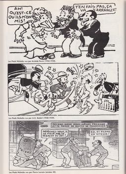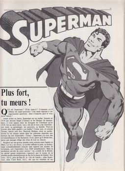 remarques: | Le Crapouillot Nouvelle Série no 99 de janvier 1989 82 pages en noir&blanc 1/ Tarzan, seigneur des singes par E.-R. Burroughs - auteur de 91 romans dont 24 avec Tarzan, 13'000 bandes dessinées et 80 films sur Tarzan, la dernière aventure de Tarzan: Tarzan and the castaways, Korak le tueur était le fils de Tarzan et non le petit blondinet frisé comme il est mentionné dans les films, ainsi que le chimpanzé du film faussement appelé Sheeta alors que dans les romans, Sheeta est la panthère noire mais conclusion: Tarzan, c'est l'éternelle jeunesse du mythe 2) Zorro, la malédiction du vengeur masqué - personnage créé par Johnston McCulley en 1919 et dont le premier épisode s'intitule: "la malédiction de Capistrano" lieu situé en Californie, premier film en 1920 avec le meilleur acteur: Douglas Fairbanks et Disney lance la célèbre série télévisée en 1958 à noter: la chanson sur Zorro par Henri Salvador Zorro est arri-vé-é-é, sans se presser é é, le beau Zorro, le grand Zorro avec son cheval et son grand chapeau 3) Superman, plus fort, tu meurs! - inventé en 1934 par Jerôme Siegel (l'auteur) et Joe Shuster (le dessinateur), - le superman venu de l'espace avec des pouvoirs spéciaux grâce à la kryptonite et tout comme Zorro, Superman a une double identité avec les grands vilains: Luthor, Braniac, le Joker et le Pinguin 4) Sherlock Holmes, le grand détective de Baker Street créé dès 1887 par Sir Arthur Conan Doyle qui se représentera comme le docteur Watson dans les romans de Sherlock Holmes, avec la fameuse citation "élémentaire, mon cher Watson" son ennemi juré sera le professeur Moriarty qui causera la mort de Holmes dans les chutes de Reichenbach, mais les lecteurs obligeront Conan Doyle à faire revivre leur héros préféré >> p. 42 s'il fallait décrire, au moral, Sherlock, disons qu'il incarna l'idéal victorien: modeste, vertueux (on ne lui connait aucune liaison), défenseur de l'ordre établi et du courage 5) James Bond 007 écrit par un auteur qui aura été lui-même un agent secret, porté au cinéma avec l'irremplacable Sean Connery 6) Fantômas, à tue et à toits avec le crime - personnage sorti en 1911 du cerveau de Pierre Souvestre et Marcel Allain - à côté des "bons" super-héros, voici le plus cruel, le plus malfaisant, l'inoxydable Fantômas, le roi du crime 7) Blake et Mortimer créés par E.-P. Jacobs en 1946 dans le Journal de Tintin dans leur première aventure: le secret de l'espadon et déjà avec Olrik, leur plus grand ennemi et autres personnages dont une des meilleures créations de Jacobs: le docteur Jonathan Septimus qui feront de ces aventures une véritable comédie humaine >> p. 62 héros de l'épopée du journal de Tintin, Jacobs fut quasiment contraint de créer le trio Blake-Mortimer-Olrik, les autres dessinateurs ayant déjà préparé des scénarios de caractère historique ou féérique et Jacobs étant le seul, à part Hergé, à faire ses scénarios, il fut prié d'écrire une histoire contemporaine réaliste en choisissant sans enthousiasme la science-fiction, ce fut un succès sans précédent >> à noter a) que l'on dit toujours Blake et Mortimer mais dans les dessins Mortimer est toujours à gauche de Blake et prendra la prépondérance sur Blake au fil des épisodes b) les membres du Olrik's Fan Club (?) mais il y a plusieurs Blake et Mortimer's Fan clubs 8) les Pieds Nickelés = d'excellents français le 4 juin 1908 les trois compères, des zigues à la coule (Croquignol, Ribouldingue et Filochard) font leur entré en force dans le numéro 9 de l'Epatant >>p. 68 le secret du succès des Pieds Nickelés réside sans doute dans le fait que, comme Arsène Lupin, ce ne sont pas des malfrats ordinaires mais sympathiques et quand il s'agit d'aller à la riflette pour la France, ils répondent présent >> un petit résumé assez intéressant: les 9 principaux super héros selon le Crapouillot: Tarzan, Zorro, Superman, les Pieds-Nickelés, Fantômas, James Bond et Sherlock Holmès |
