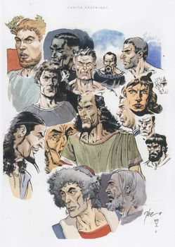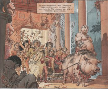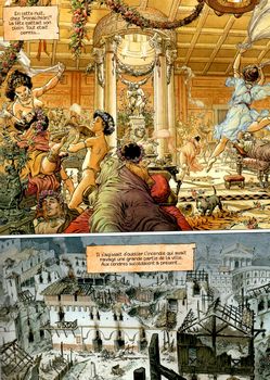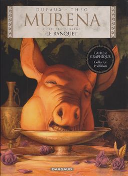 remarques: | 4 ans après le tome 9, 10ème volet de la série Murena introduction par Dufaux sur Theo, le nouveau dessinateur, après la mort de Delaby en 2014 à l'âge de 53 ans la couverture de l'album: un tour de cochon par Delaby? - le récit reprend au banquet de Trimalchion, l'affranchi où se déroule la dernière rencontre entre Néron, Lucius Murena, Pétrone le poète, Ruffalo le centurion, et le Besogneux, le bossu criminel qui agit sur l'ordre de Tigellin - réconciliation entre Néron et Lucius >> p. 15 à noter: les récipients à vomitorium mais à la sortie du banquet, Lucius est agressé par le Besogneux et son homme de main >> p. 20 à 24 le combat épique entre Lucius et le gladiateur, des banquets ensanglantés - en mauvais état, Lucius est recueilli par la soeur de Pison, le sénateur qui le confie aux soins de sa guérisseuse, une adepte de la Locuste >> p. 39 mais ce sera surtout grâce aux soins sensuels de Lemuria, la soeur de Pison et à l'intérêt porté à Lucius par le dieu Mercure (le dieu de Néron qui s'occuperait aussi de Lucius?) que Lucius reprend ses esprits après 17 jours de coma, toutefois Lucius a perdu la mémoire et ne se souvient même plus de son nom alors que Pison et ses amis complotent contre Néron - et Pison veut maintenant utiliser l'amnésie de Lucius pour tendre un piège lors d'un nouveau banquet, cette fois chez Antinea, une ancienne prostituée devenue riche mais l'empereur échappe à cet attentat et, persuadé que Lucius qui lui avait donné ce lieu de rencontre, par l'entremise de Pison et Lemuria, est l'instigateur de l'attentat, Néron ordonne alors de retrouver et d'arrêter Lucius Murena - toutefois entretemps Lucius et Lemura ont déjà pris le large - le passé de Lucia Murena est effacé et là dernière page nous montre un Murena crucifié dont on ne comprend pas vraiment le sens + en fin d'album un cahier graphique de 8 pages (sans grand intérêt) > le graphisme de Theo est plus fin que celui de Delaby (du moins pour les personnages) et reste agréable à la lecture sauf pour les décors que Delaby savait mieux restituer, quant au scénario de Dufaux, on pourrait le qualifier aussi de quo vadis sans se surpasser, et ce 10ème tome est surtout dédié aux banquets avec une couverture porcine Néron retrouvera-t-il Lucius dans un 11ème album, il y aurait 4 cycle de 4 volumes annoncés, il resterait donc encore 5 volumes mais la série sera-t-elle continuée après la mort de Delaby , ce premier volume semble être le cas, il semble toutefois que Theo n'a pas l'intention de continuer malgré un graphisme très honorable et Dufaux n'a peut'être plus beaucoup à apprendre à ses lecteurs citation au 4ème plat: "le bonheur que Rome tire de la victoire fait le malheur des peuples, à l'exception du peuple romain, quelle valeur si faible soit-elle, faut-il accorder à une joie qui impose tant de souffrances? que signifie la satisfaction d'une seule ville au milieu d'une telle accumulation de malheurs qui préfigurent la fin du monde? Orose histoires livre IV |
