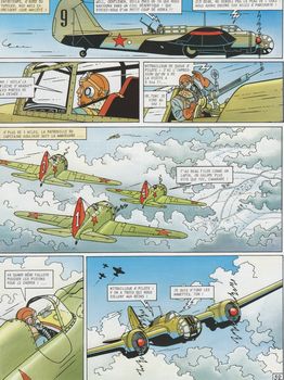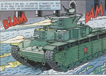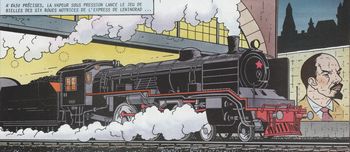 remarques: | dans les années 30, Dickson est chargé d'expatrier de Moscou l'homme mystérieux à l'écharpe rouge, course-poursuite en URSS depuis Moscou jusqu'en Mer Noire via Kharkov et la Crimée (Balaklava) durant laquelle un soi-disant traître russe (l'homme mytérieux de Moscou), aidé par Harry Dickson est pourchassé par les services du NKVD alliés avec Georgette Cuvelier après une chasse-croisée à travers Moscou, les évadés réussissent à prendre le large par voie ferroviaire, mais un train blindé les guette déjà un peu plus loin >> p. 8/9 dans les égouts de Moscou (moins élégant que son métro) >> p. 13 l'express de Koursk à l'étoile rouge dans toute sa splendeur >> p. 22 Dickson sauve la vie de son pire ennemi >> p. 24 le miracle des loups par Georgette Cuvelier >> p. 25 si nous avions un enfant à deux (Georgette dixit) les fugitifs sont aidés dans leur fuite par des cosaques et pourront continuer leur odyssée vers Kharkov où sur une base de l'aviation soviétique, ils s'emparent d'un avion-bombardier d'assaut type Tupolev, vite rejoints par la chasse soviétique (les ratas), nos amis sont abattus ensurvolant la Crimée >> p. 37 le jeune Leonid Breshnev s'adonnant aux joies du sauna dans sa datcha après avoir dérobé la voiture d'un apparatchik et à nouveau aidés par des résistants russes, Dickson et ses compagnons réussissent à rejoindre le port de Balaklava et à s'embarquer pour le Bosphore où ils ont rendez-vous avec un hydravion anglais après qu'un navire de guerre soviétique dissimulé en cargo ait fait coulé leur navire >> p. 43 l'assaut avec le blindé soviétique la suite dans le prochain album "échec au roi" >>> le titre de l'album aurait plutôt dû être la poursuite fantastique ou la poursuite sans-fin, le scénario n'est pas des plus recherché, mais toujours un graphisme respectable annexes - couverture de l'album - page de garde - extrait de page - la locomotive rouge Lénine - un tank soviétique d'époque à trois tourelles pivotantes |