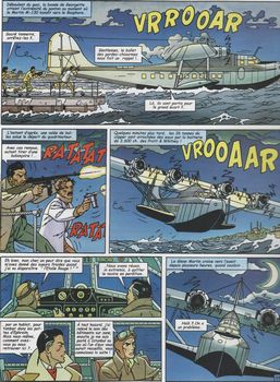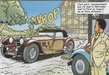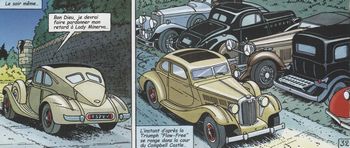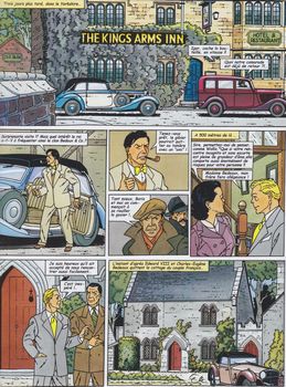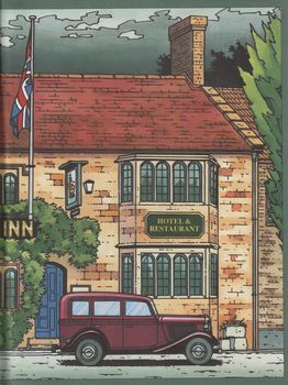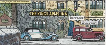 remarques: | suite de la conspiration fantastique nos héros avec l'homme mystérieux de Moscou arrivent à Istamboul où ils sont à nouveau pourchassés, mais parviennent à s'échapper grâce à un hydravion Martin M-130 qui les conduit à Ostie près de Rome où ils sont pris en charge par le Vatican >> p. 8 le senhor Oliveira avec skis et cravattes >> p. 11 l'hydravion Martin M-130 >> p. 13 même sa sainteté Pie XII et l'archevêque de Canterbury sont de la partie >> p. 15 la Fiat topolino >> p. 16 clin d'oeil à don Camillo (Fernandel) pistés par la sureté italienne, les trois "rosbiffe" sont acheminés en voiture et en soutane par les ecclesiastiques jusqu'à Nice où ils continuent leur voyage par voilier et abordent un peu plus tard la côte écossaise >> p. 20 des hommes de Dieu endiablés entretemps on apprend que le roi d'Angleterre, Georges V est décédé et c'est son fils Edouard (le futur Edouard VIII) qui doit lui succéder en Ecosse, les trois hommes sont pris en charge par un groupe de politiciens qui ne sont pas d'accord avec la politique pro-nazie d'Edouard VIII et veulent l'écarter du pouvoir >> p. 26 le Loch Lomond, clin d'oeil à Hergé >> p. 29 l'Inn Admiral Benbow, allusion à l'île au trésor >> p. 32 la Triumph Flow-Free >> p. 33 les explications eu peu compliquées de toute l'affaire où l'on apprend que l'homme mystérieux de Moscou est en fait Nicolas (qui en son temps a été enlevé et élevé à Moscou), qui est le frère jumeau d'Edouard et maintenant le plan des conspirateurs est de remplacer Edouard par Nicolas, les discussions se poursuivent à White Lodge avec des politiciens importants tel que Churchill (page 33) et Chamberlain (page 39) qui a l'air plus décidé qu'il ne l'avait été en 1939 >> p. 29 le fameux breakfast anglais: eggs up with bacon and sausages, white toasts and pancakes with marmelade and jam, orange juice and coffee (manquent the mushrooms, tomatoes, scrambled eggs and tea) >> p. 37 la Ford V8 cabriolet et la Mercedes décapotable 540 K drame final: Nicolas est abattu par erreur par les soviets qui l'on confondu avec Edouard et le vrai Edouard est sauvegardé par Georgette Cuvelier et ses amis nazis, mais malgré tout Edouard devra quand même abdiquer de par sa liaison avec Wallis Simpson, une divorcée américaine, Georges VI lui succédera et prendra une attitude anti-nazi, quant à Harry Dickson et Tom Wills, tous leurs efforts depuis Moscou jusqu'en Ecosse auront été pour des "nuts" >> la boucle est effectivement bouclée, mais le scénario ne convainc toujours pas vraiment malgré une idée assez originale alors que le graphisme reste encore acceptable mais commence déjà à se dégrader quelque peu annexes - couverture de l'album - extraits de page - pages de garde Kings Arms Inn - Ford ou Mercedes? - Triumph Free-Flow |
