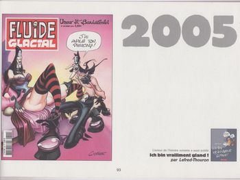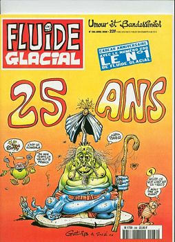 remarques: | Fluide glacial est un magazine de bande dessinée humoristique fondé en 1975 par les dessinateurs Marcel Gotlib, Alexis et par Jacques Diament cet album anniversaire comprend les meilleurs couvertures du magazine de 1975 à 2005, existe toujours en 2018 les meilleures couvertures - no 1 de 1975 - 1980, la vie d'Albert Einstein - 1982, Carmen cru - - 1986, l'esprit de famille - 1991, Liteul Kevin - 1994, délivrance - - 2004, melody bondage - 2005, ich bin vraiiiment gland! - >> assez intéressant, un des meilleurs magazines d'humour noir avec Hara Kiri, Echo des Savanes, Rhâ Gnâ Gnâ, etc Annexes - couverture de l'album - premier numéro de Fluide Glacial - une page de l'album (2005) - Fluide glacial 25 ans - diverses couvertures Information - Fluide glacial est un mensuel de bandes dessinées humoristiques où l'humour en question (l'"umour") est généralement bon enfant, libéré sans être provocateur, libertaire sans être forcément politique mais aussi décalé - la publication tire son nom d'un article de farces et attrapes (l' ampoule de verre qui, une fois brisée libère un liquide répandu généralement sur une chaise glaçant le postérieur de celui qui s'assied dessus) - le magazine est publié par les éditions AUDIE ("Amusement Umour Dérision Ilarité Et toutes sortes de choses") les bandes ont été publiées en noir et blanc depuis la création du magazine, ce n'est que fin 2003 (no 328) que des planches en couleurs sont apparues - en plus des bandes dessinées, le magazine édite des articles culturels, biographies d'auteurs, nouvelles et récits, aucune publicité n'y apparaît, sinon pour le magazine lui-même et les auteurs maison, ou par "copinage" - parallèlement à la parution régulière et sous la férule de son rédacteur en chef en mission spéciale Bruno Léandri, paraît tous les trois mois avec une sobre régularité: le Fluide Glacial Hors Série; à un Hors Série à thème (en printemps/automne) avec des histoires inédites centrées sur un thème commun succède un Hors Série Série (en été/hiver) - reprenant le meilleur des histoires publiées il y déjà des années, de mars 2010 à septembre 2013 existe un hors-série nommé Fluide.G (prononcé Fluide point G), axé sur l'humour sexy et féminin - Fluide Glacial fait partie des magazines issus de l'émergence de la bande dessinée pour adulte dans les années 1970, à l'époque, l'esprit libertaire de mai 1968 pousse une génération d'auteurs à sortir des contraintes imposées par la bande dessinée pour la jeunesse ainsi, plusieurs auteurs de Pilote partent fonder leur propre magazine, parmi lesquels Mandryka, Bretécher et Gotlib qui fondent l'Écho des savanes en mai 1972 - au bout de dix numéros de "l'écho des savanes", Gotlib quitte le journal et part fonder un nouveau magazine avec son ami d'enfance Jacques Diament et le dessinateur Alexis, ils sont accompagnés par Solé, Forest, Masse et Lacroix, - les statuts de la société sont déposés le 1er avril 1975, ils sont rapidement rejoints par Binet, Édika, Goossens, Masse, Maëster, Franquin et l'espagnol Carlos Giménez qui formeront la première génération d'auteurs, inspirés par les magazines américains Mad et Zap Comics, - les auteurs de Fluide Glacial cherchent à s'exprimer de manière totalement libérée, le magazine devient vite mensuel, - deux ans après la création du journal, l'un de ses fondateurs, Alexis, décède; son nom continue, par hommage, à être mentionné dans l'ours du journal en tant que "directeur de conscience", - de 1975 à 1990, plusieurs séries devenues emblématiques de Fluide Glacial voient le jour: les Bidochon de Binet, Superdupont de Lob et Gotlib, Carmen Cru de Lelong, Sœur Marie-Thérèse des Batignolles de Maëster et Jean-Claude Tergal de Tronchet - fin 1979, une rubrique cinéma, le Zootrope épatant, écrite par Jean-Pierre Jeunet, est créée - à la même période éclate une crise qui oppose plusieurs auteurs du magazine à Jacques Diament; en effet, alors que Gotlib avait décidé lors de la création du journal que chaque membre de l'équipe verrait ses pages payées au même prix, un dessinateur fit remarquer que ce dernier et Diament avaient une part de gains plus importante, plusieurs autres en profitèrent pour demander à Diament une augmentation du prix des pages pour tous, celui-ci refusa en objectant que cela représenterait une dépense trop importante pour le journal et n'augmenta que les dessinateurs considérés comme essentiels au magazine, - les 4 membres qui avaient mené la fronde: Boucq, Cabanes, Lucques et Gibrat, mirent alors à exécution leur menace de quitter l'équipe si leurs revendications n'étaient pas entendues et cessèrent leur collaboration avec Fluide glacial, même s'il arriva à certains d'entre eux d'y revenir plusieurs années plus tard - à la suite d'une couverture de 1989 montrant Sœur Marie-Thérèse des Batignolles avec une poupée gonflable de Jésus (no 162), le militant d'extrême droite Bernard Antony attaque le journal, mais perd le procès - en 1995, au départ en retraite de Jacques Diament, le titre est revendu, en même temps que les éditions Audie (qui publient les albums des dessinateurs de Fluide Glacial), aux éditions Flammarion - la période 1975-1995 est retracée dans le livre de Jacques Diament: Fluide Glacial, Gotlib...et moi, édition L'Harmattan 2010 - Fluide Glacial connaît alors plusieurs réorganisations qui entament à peine son succès, avec des tirages atteignant jusqu'à 100 000 exemplaires - après le rachat des éditions Casterman, en 1999, Flammarion envisage un rapprochement entre ses deux éditeurs de bande dessinée avant d'être à son tour racheté par le groupe italien Rizzoli-Corriere-della Sera, - pour Fluide Glacial commence une période de doute qui se traduit par des désaccords au sein de l'équipe rédactionnelle, en 2003, le directeur de Casterman, Louis Delas, devient direct