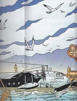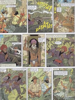 remarques: | dernier album paru en 2004 avec l'annonce du prochain album jamais paru jusqu'en 2009 "les gardiens du gouffre" (il paraîtra finalement en 2014), cet album no 8 est la suite de l'album no 4 "le royaume introuvable" où l'on connait maintenant le contenu du mystérieux manuscrit d'Alexandre révélant l'histoire de l'exode interplanétaire des Atlantes (référence à l'énigme de l'Atlantide de Jacobs) un explorateur suédois débarque à Berlin du IIIème Reich avec un groupe de lamas tibétains en visite à l'Ahnenerbe pour déchiffrer le contenu du manuscrit d'Alexandre tombé aux mains des nazis par l'entremise de Georgette Cuvelier (voir tome 4 l'affaire de la cartouche d'Alexandre) >> p. 5 on constate que le contenu du manuscrit est d'origine atlante, Alexandre s'en était emparé lors de son expédition en Himalaya >> p. 5 l'histoire de l'exode interplanétaire des atlantes à Londres, un sikh hindou est pourchassé par le gang des nécrophages, il meurt en arrivant chez Harry Dickson, mais réussit à avertir celui-ci d'un grand péril qui menace le monde depuis le Tibet de retour en Egypte, Georgette avec l'aide d'un lama tibétain, découvre le secret du sphinx caché dans la grande pyramide >> p. 12 le bloc de pierre qui se soulève dans l'air utilisant une force anti-pesanteur >> p. 14/15 le duel aux rites magiques et psychiques entre Georgette et le Grand - la lutte psychique entre Georgette et le grand prêtre d'Horus, le gardien de l'héritage d'Alexandre le Grand >> p. 18 un des secrets du dernier manuscrit: le pouvoir d'anti-gravitation et Georgette l'inaugure en s'envolant sur la statue du sphinx puis l'équipe nazie avec Georgette s'envolent pour le Tibet avec un Dornier 26 à la recherche d'autres découvertes, mais Dickson et ses amis se lancent aussi sur ses traces s'en suit une série d'aventures dont >> p. 23 la visite chez le saint yogi Viswakarma >> p. 25 visite du palais de Mysore qui possède un millier de portes couronnées de défenses d'éléphant avec chasse au tigre et aux serpents >> p. 33 le grand maître du temple de fer (un vaisseau extra-terrestre des atlantes dans le massif himalayen, protégé par les yétis >> p. 37 combat entre les troupes anglaises et les parachutistes allemands pour le temple de fer finalement les descendants atlantes détruiront eux-mêmes leur vaisseau et autres découvertes, alors que Georgette parvient à nouveau à s'enfuir à bord d'un vimana volant (genre d'aérodyne) nomenclature - aérodyne = appareil volant plus lourd que l'air (opposé à aérostat) - tantrisme = pratique inspirée de la religion hindouiste qui allie le yoga et la médiation à la sexualité - nécrophage = qui se nourrit de cadavres - glossophage = qui se nourrit du nectar des fleurs - syringe = tombe royale de l'Égypte pharaonique, creusée dans le roc en forme de galerie - cénotaphe = tombeau élevé à la mémoire d'un mort et qui ne contient pas son corps - hiérophante = prêtre qui présidait aux mystères d'Éleusis et instruisait les initiés - Eleusis = culte à mystères, de nature ésotérique, effectué dans le temple de Déméter à Éleusis près d'Athènes - cosmogonie = récit mythologique qui décrit ou explique la formation du monde >> scénario et graphisme encore très respectables, mais très mystiques et ésotériques avec beaucoup de référence aux récits de Jacobs: le mystère de la grande pyramide et l'énigme de l'Atlantide annexes - couverture de l'album - page de garde - extrait de page |