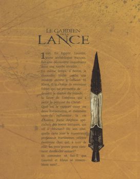 remarques: | Berlin 1936, le SS Klaus est convoqué par Hitler pour retrouver la lance originale de Longus, celui qui détiendrait cette lance deviendrait le maître de l'univers >> p. 5 à noter que le visage de Hitler ne nous sera jamais montré dans cet épisode Grèce 1936 une jeune femme découvre une partie de la lance de Longus >>> série ésotérique-fantastique rappelant les aventures de Indiana Jones, mais cette fois le Graal, c'est la lance de Longus >>> bon graphisme toutefois le scenario n'est pas très clair et la couverture de l'album ressemble beaucoup aussi à l'aventurier Indiana Jones il ne manque que le fouet! Information un vulgaire morceau de métal découvert lors d'une fouille archéologique en Egypte, pourtant celui-ci est une pièce d 'un puzzle très compliqué, certains disent que ce métal est plus ancien que notre système solaire et celui qui réussirait à reconstituer l'objet initial serait investi d'un pouvoir sans limites, le seul autre morceau répertorié est incrusté dans un objet mythique: la lance de Longinus, la lance du Christ, et celle qui se trouve au musée de Hofburg à Vienne en est une copie, la vraie lance a disparu à un moment inconnu dans l'histoire et nos protagonistes la recherchent depuis longtemps, très longtemps à commencer par un officier de l'Allemagne nazie de 1936 ainsi que par un archéologue menant ses recherches dans la Vallée des Rois, et si ces deux-là étaient frères? et s'ils avaient été victimes d'une malédiction dès leur premiers jours? les quatre prochains albums devraient nous en donner la réponse |